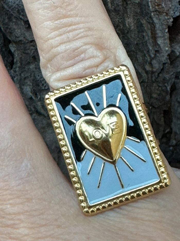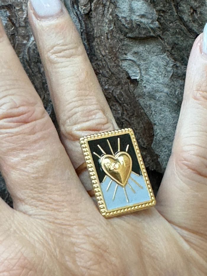 Bague Mile Mila réglable carrée xl résine noire et grise cœur acier inoxydable or neuve