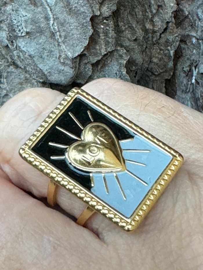 Bague mile Mila médaille carrée cœur résine grise noire - photo numéro 1