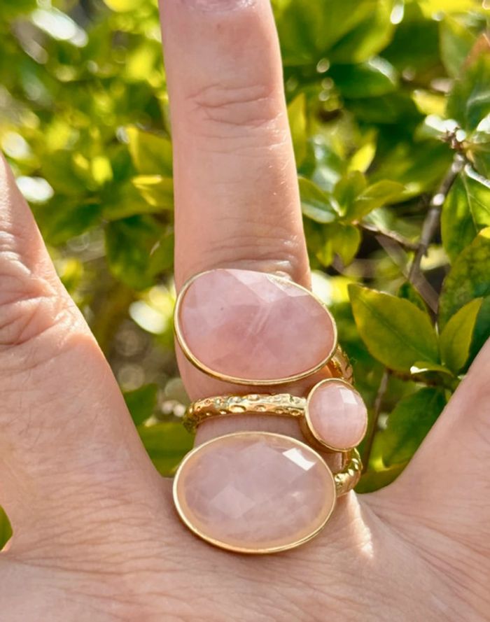 Grosse bague réglable acier inoxydable or pierres pavés jade rose habaha paris