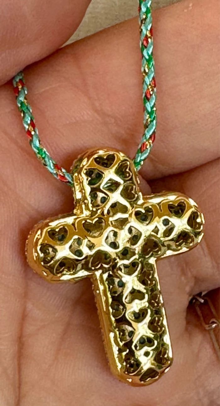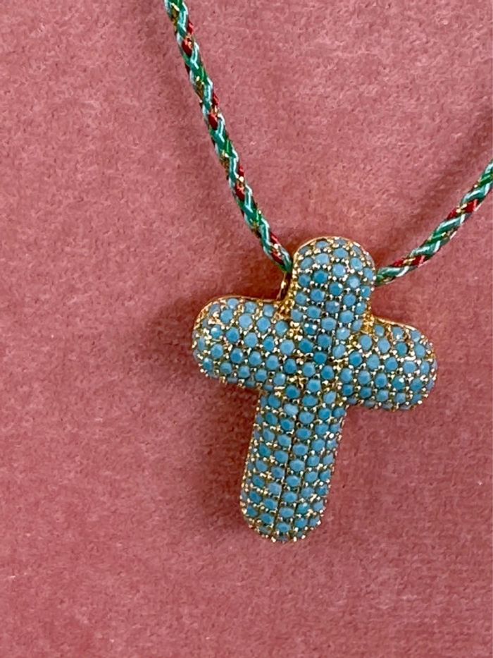 Superbe collection cordon tressé chaîne réglable grosse croix épaisse acier inoxydable or et perles fines turquoise neuve dans pochon Marque HABAHA Paris neuf dans son pochon à l’effigie de la marque