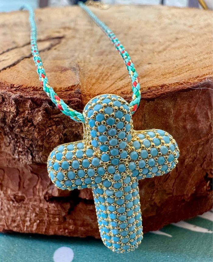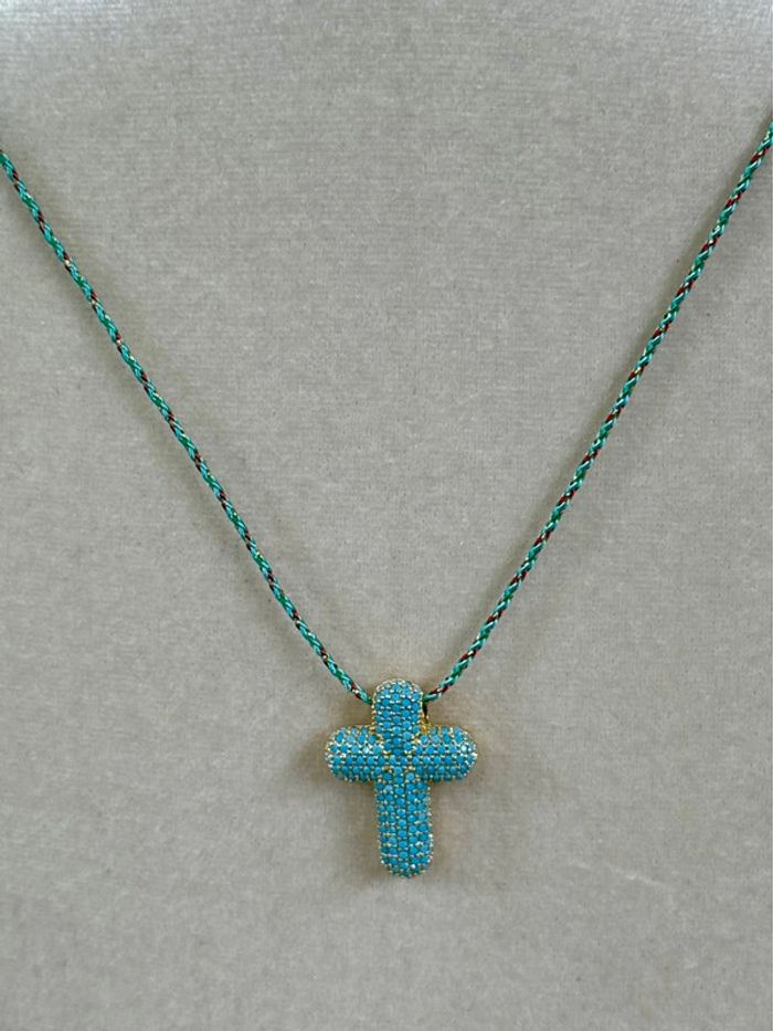 Collier habaha Paris cordon tressé réglable grosse croix épaisse perles turquoises - photo numéro 1