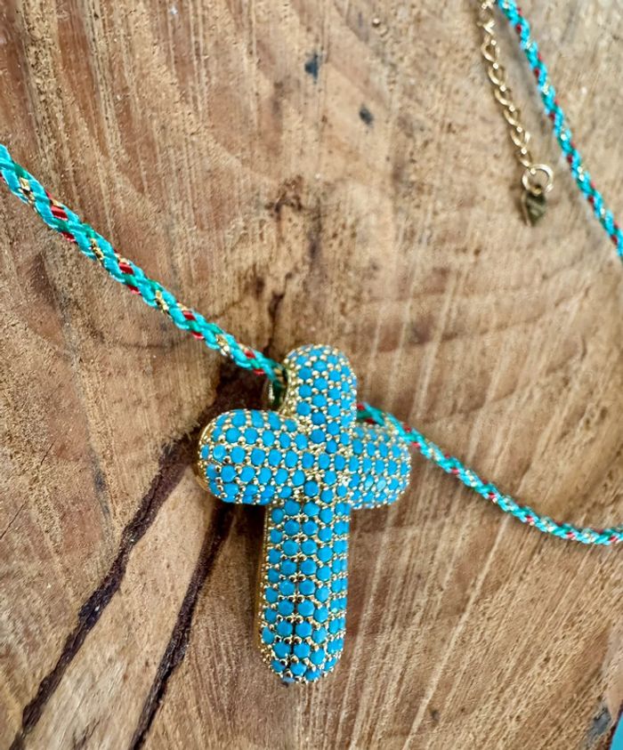 Collier habaha Paris cordon tressé réglable grosse croix épaisse perles turquoises - photo numéro 7