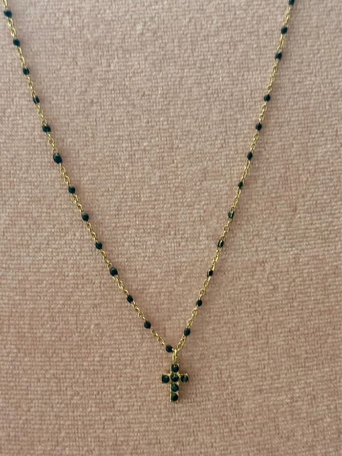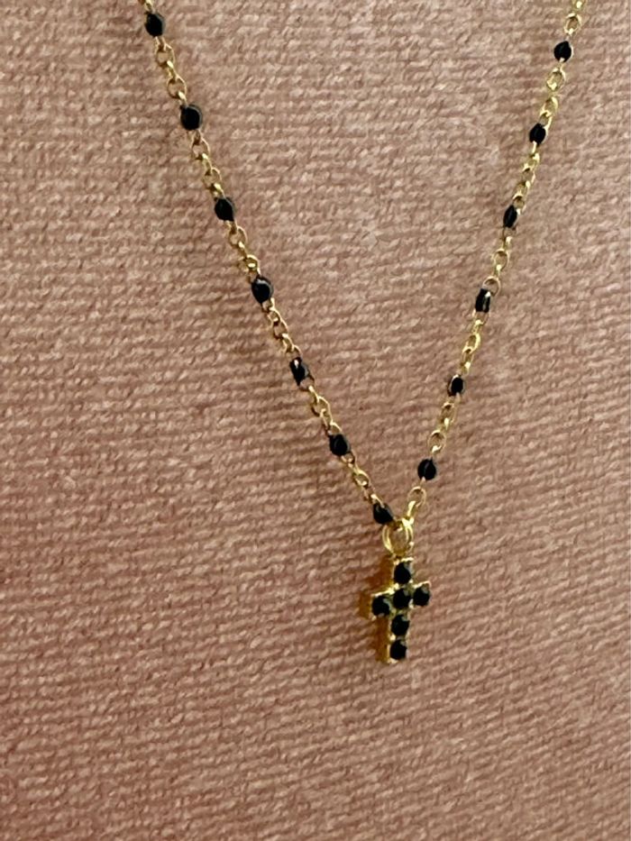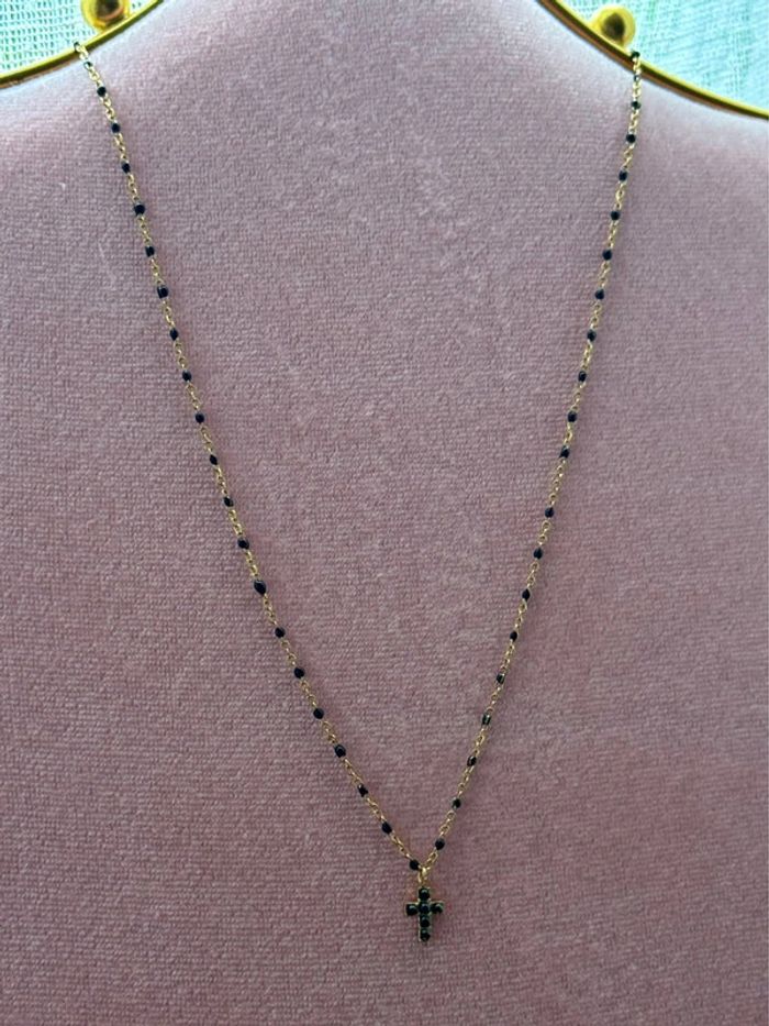 Collier chaîne réglable acier inoxydable or perles résine noires pendentif petite croix cristaux noirs neuf dans pochon
