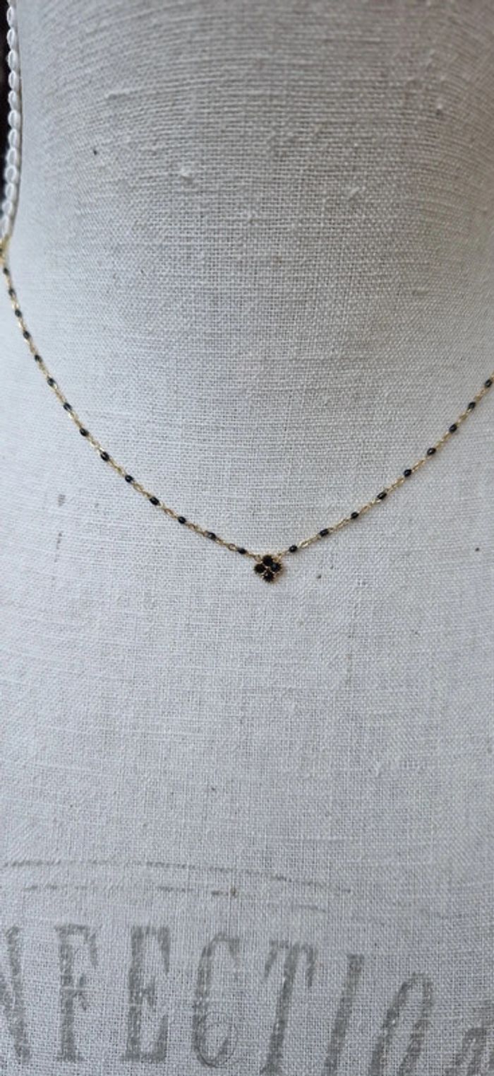 Collier chaîne acier inoxydable or de qualité réglable perles résine noires trèfles cristaux noirs veux dans pochon