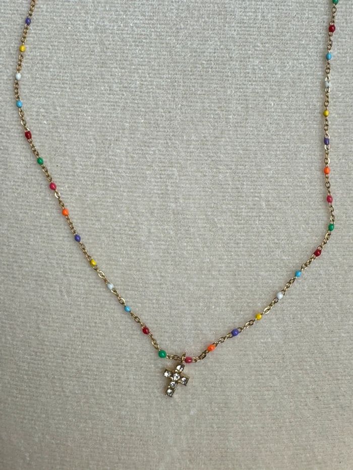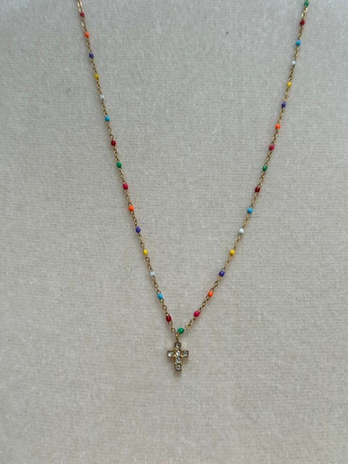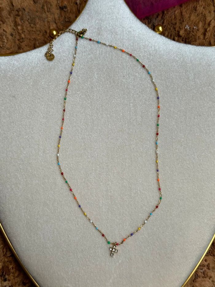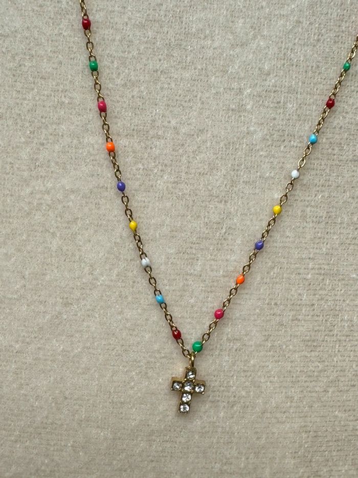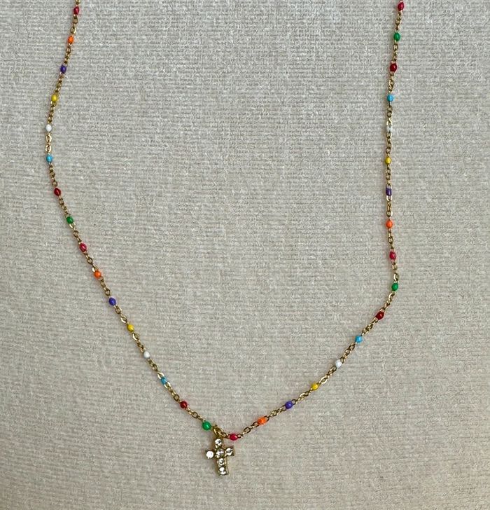 Collier chaîne réglable acier inoxydable or perles résines multicolores pendentif petite croix cristaux blancs neuf dans pochon
