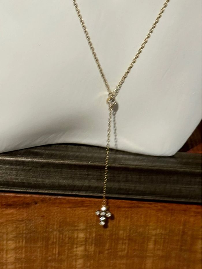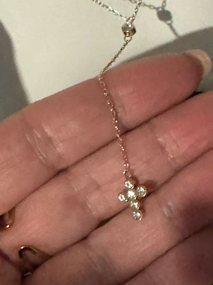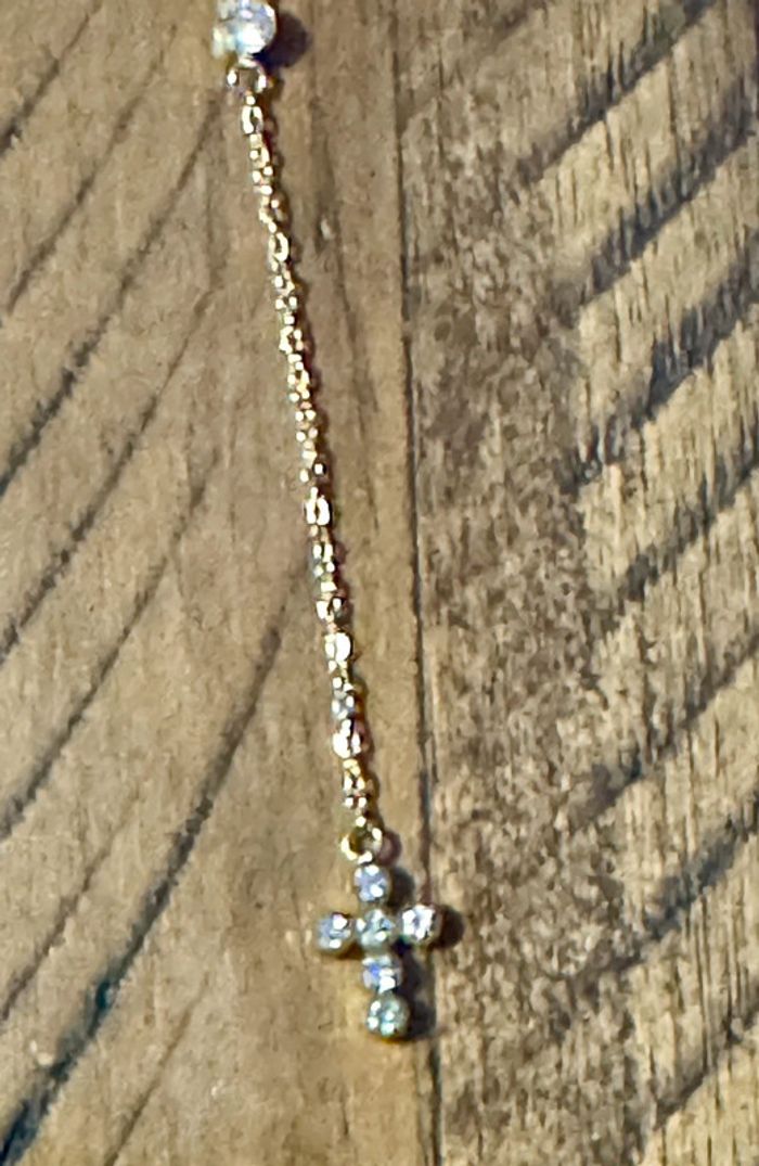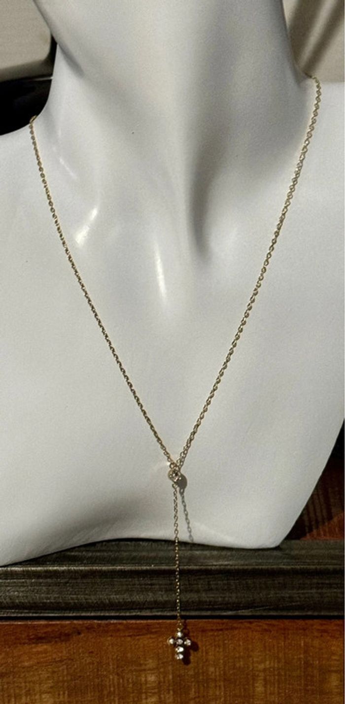 Collier C acier inoxydable or de qualité réglable cristal au centre et petite croix cristaux neuf dans pochon et pochette cadeau
