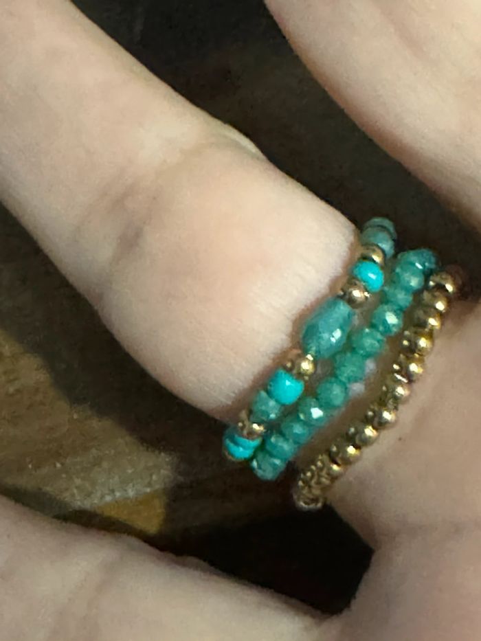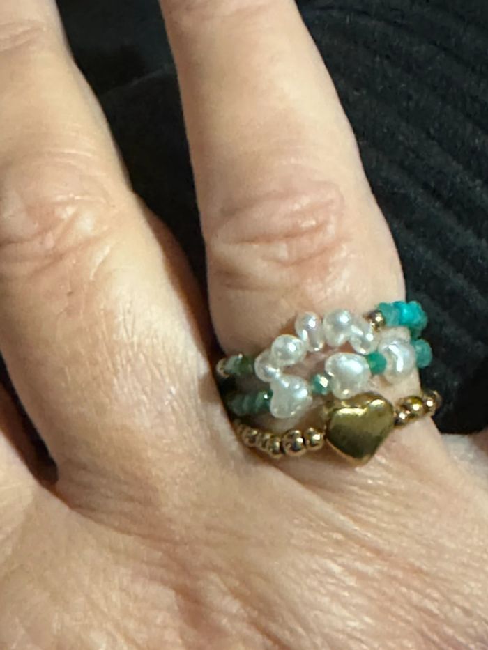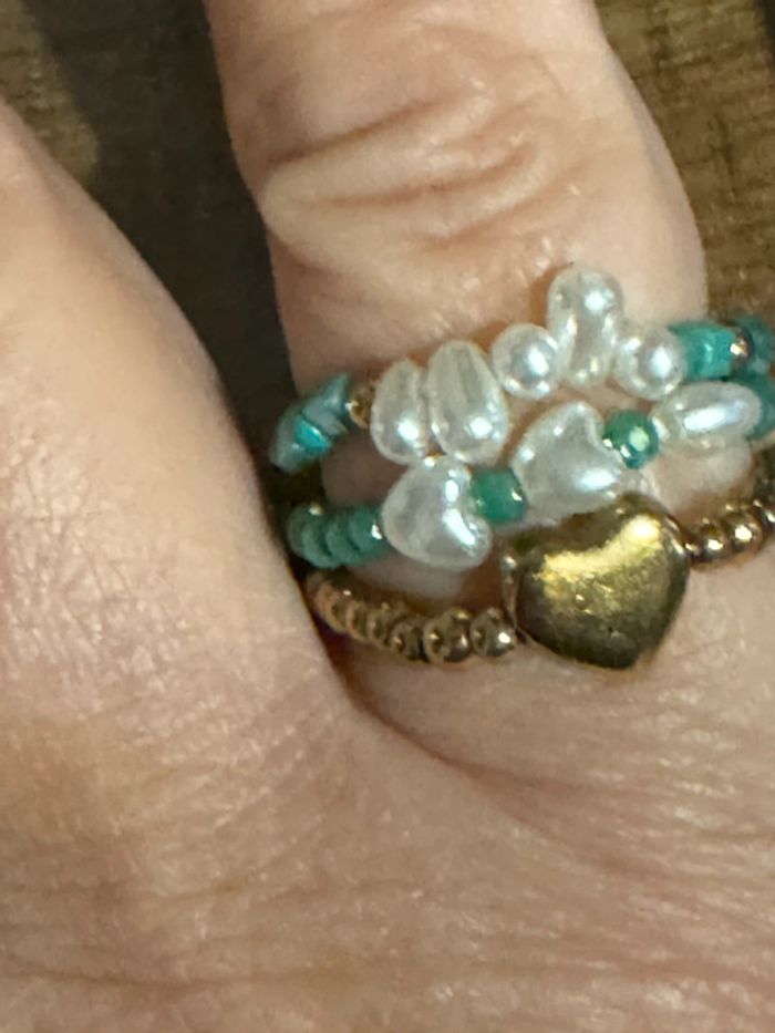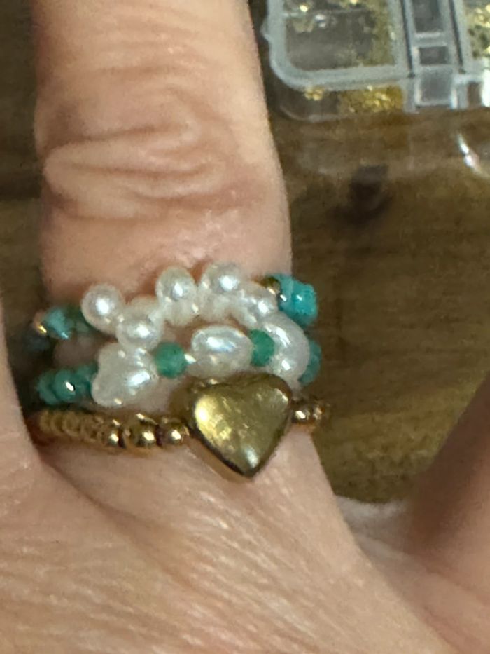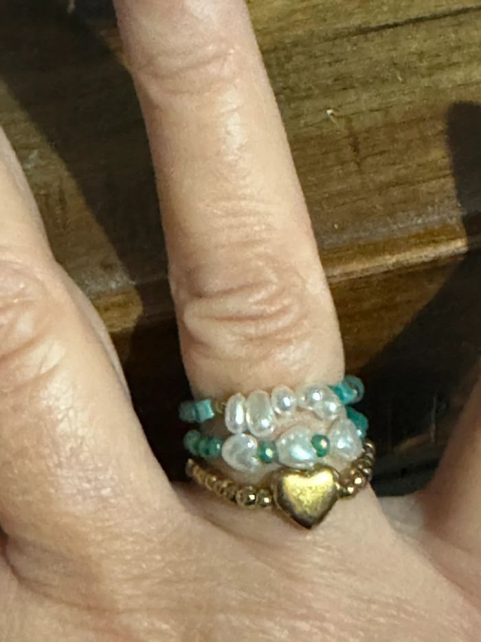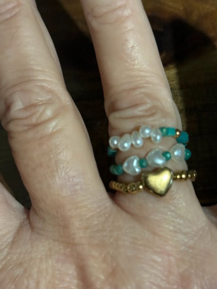 Lot de 3 bagues réglable (élastique) perles turquoises vertes , écrues d’eaux douces et une bague boule cœur en acier inoxydable or de qualité neuves dans pochon