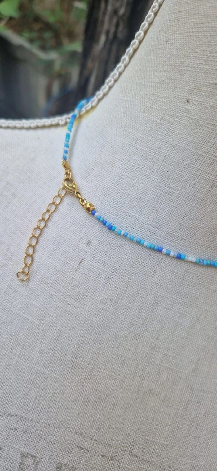 Collier réglable acier inoxydable et perles tons pastels cœur œil neuf et de qualité dans pochon et pochette cadeau