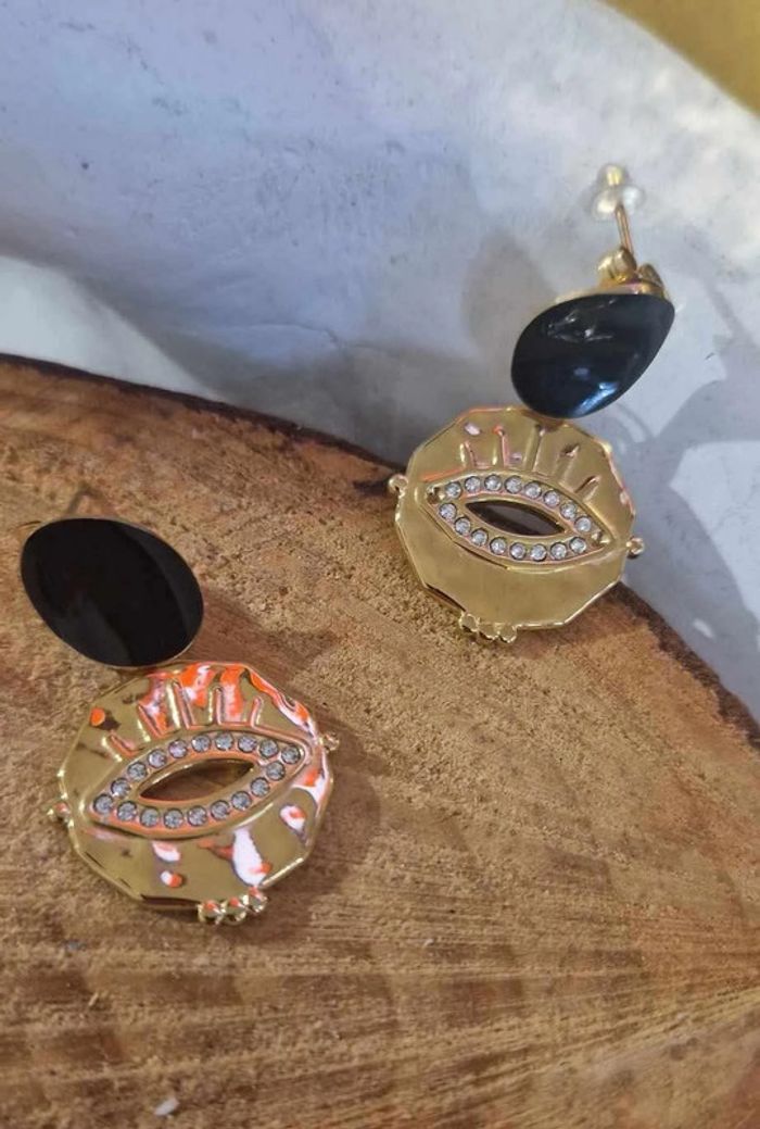 Boucles d’oreilles 2 médailles acier inoxydable or résine noire médaille ondulée œil découpe et cristaux