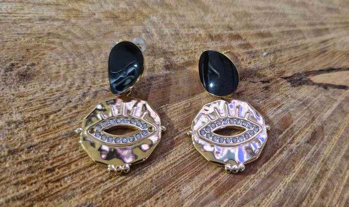 Boucles d’oreilles 2 médailles  acier inoxydable or œil résine noire cristaux - photo numéro 1
