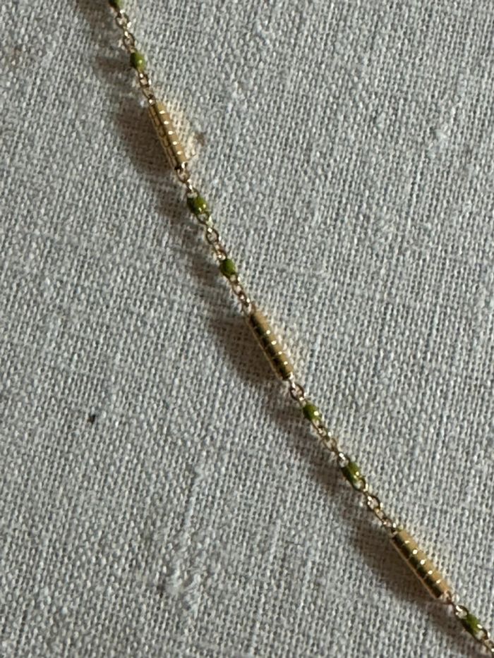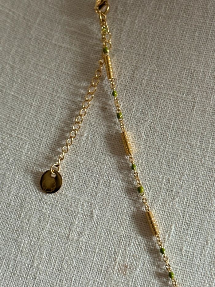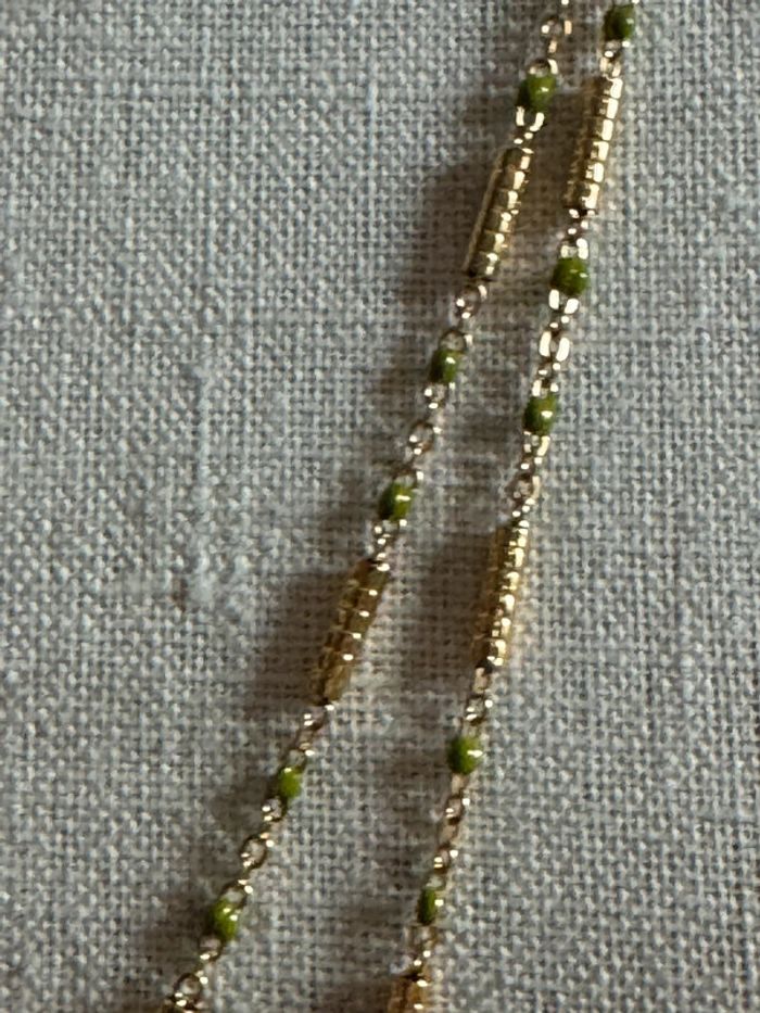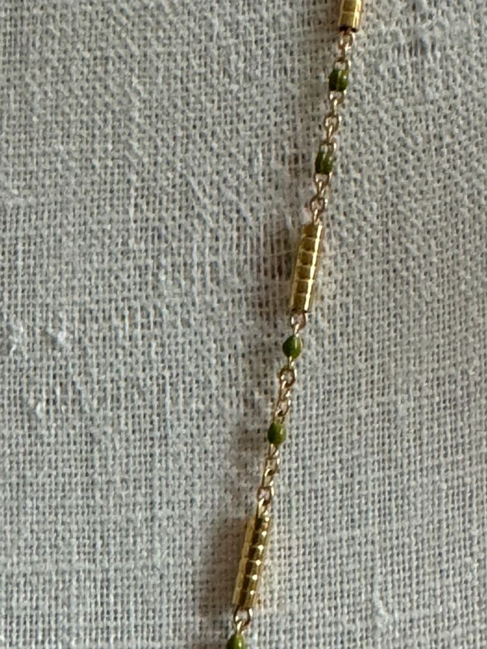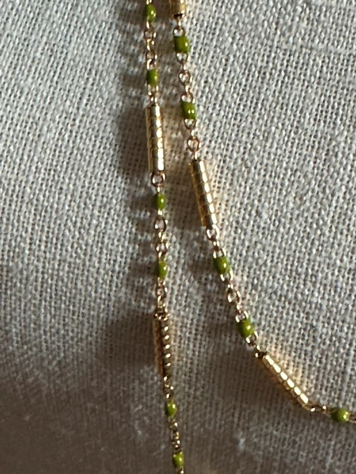 Coll sautoir réglable acier inoxydable or perles résine vertes kaki de qualité neuf dans pochon et pochette cadeau