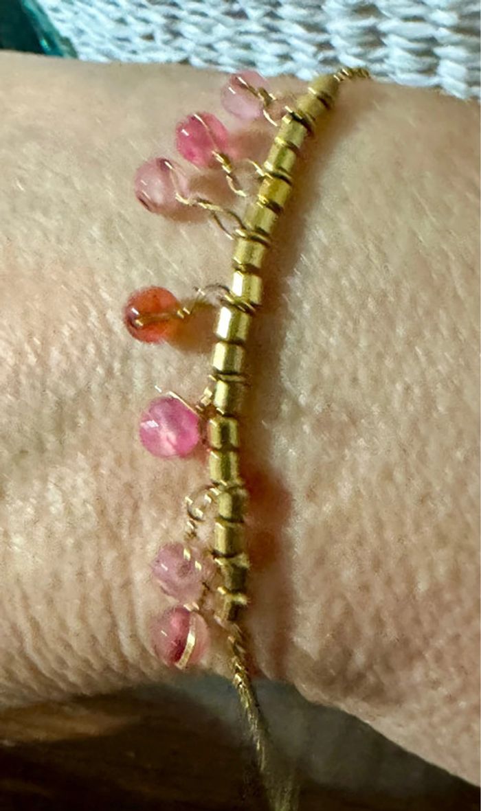 Bracelet réglable acier inoxydable or de qualité perles dorées et roses en breloque neuf dans pochon