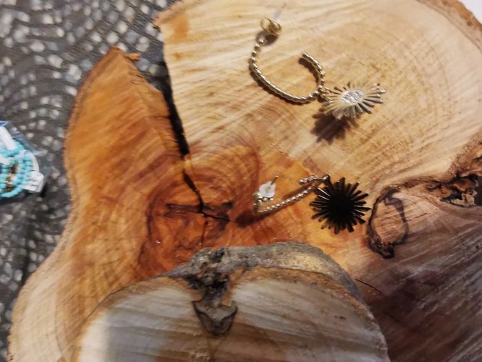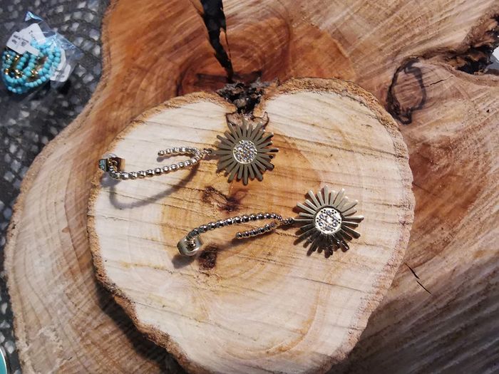 Créoles ovales travaillées avec en breloques un soleil cristaux au centre en acier inoxydable or neuve dans pochon