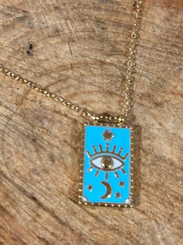 Collier réglable acier inoxydable or médaille carrée étoiles  œil lune