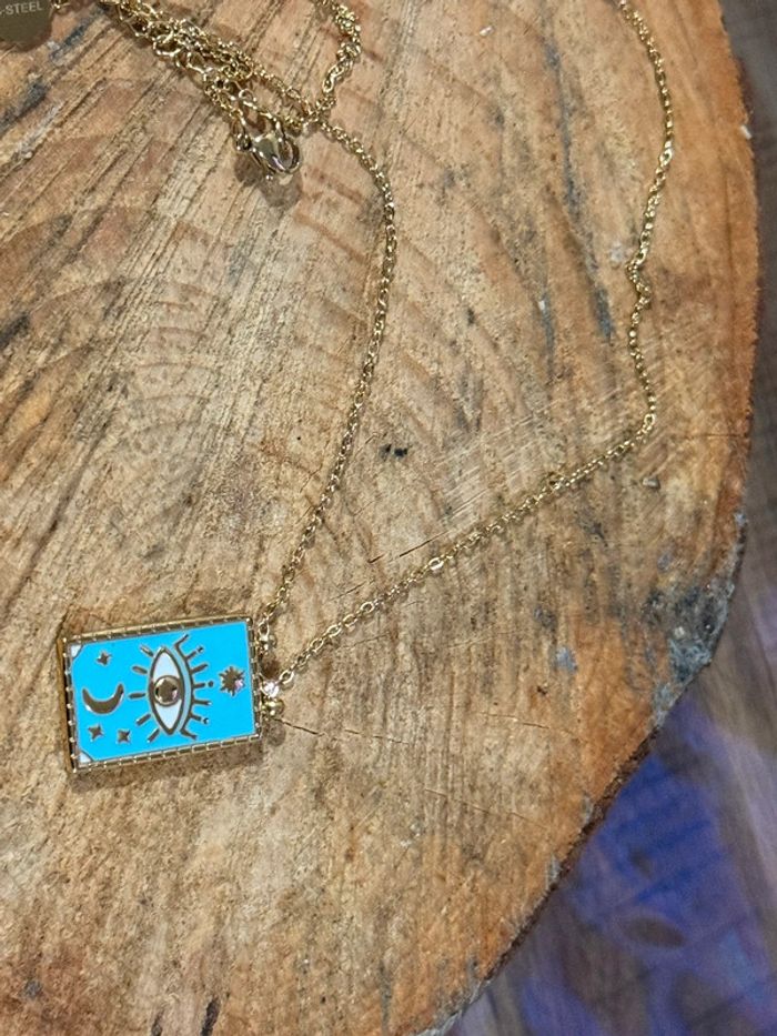 Collier réglable acier inoxydable or médaille carrée étoiles  œil lune - photo numéro 1