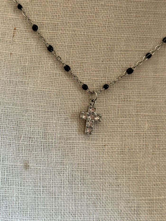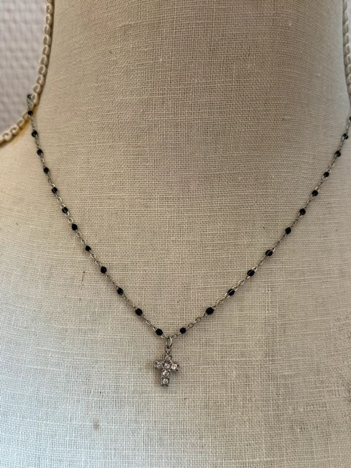 Collier réglable acier inoxydable argent perles résine noires croix zircons - photo numéro 1