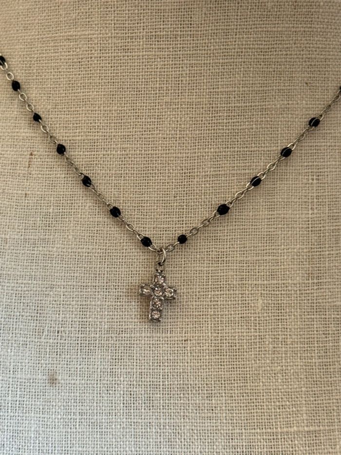 Collier réglable acier inoxydable argent perles résine noires croix zircons