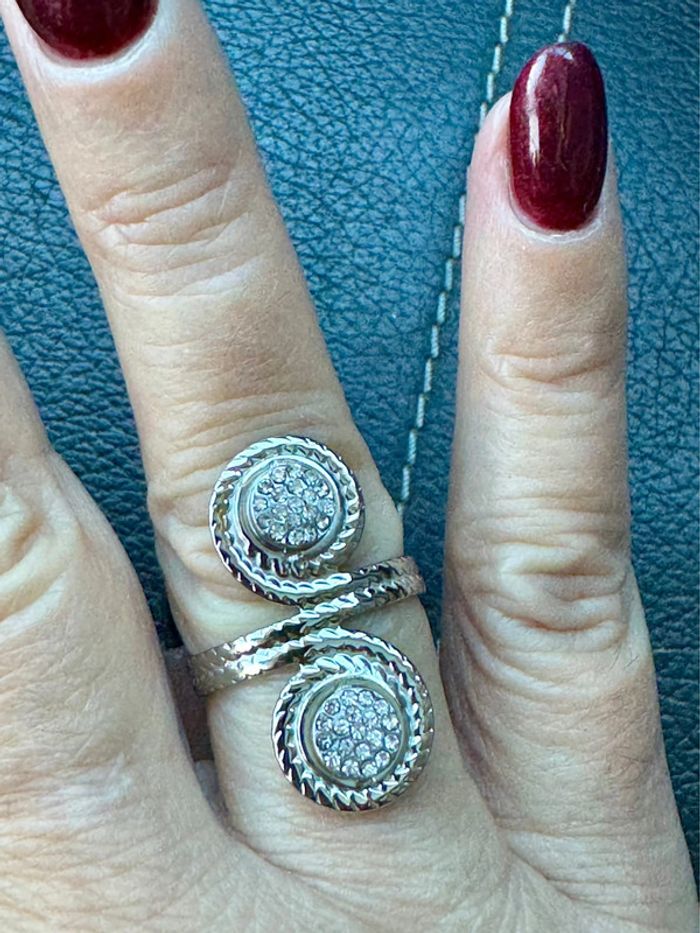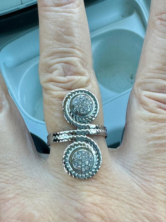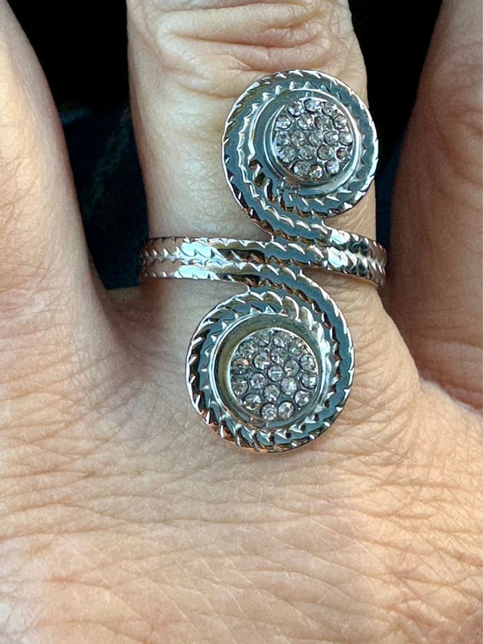 Bague réglable acier inoxydable argent 2 pavés ronds cristaux blancs neuve dans pochon