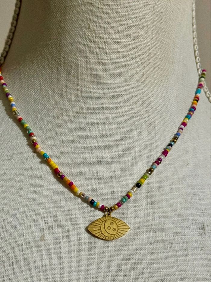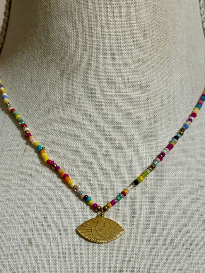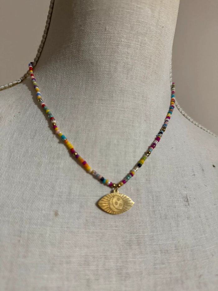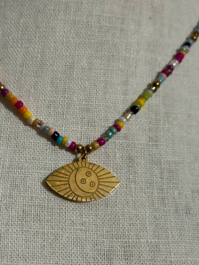 Collier réglable acier inoxydable or perles couleurs médaille œil - photo numéro 1