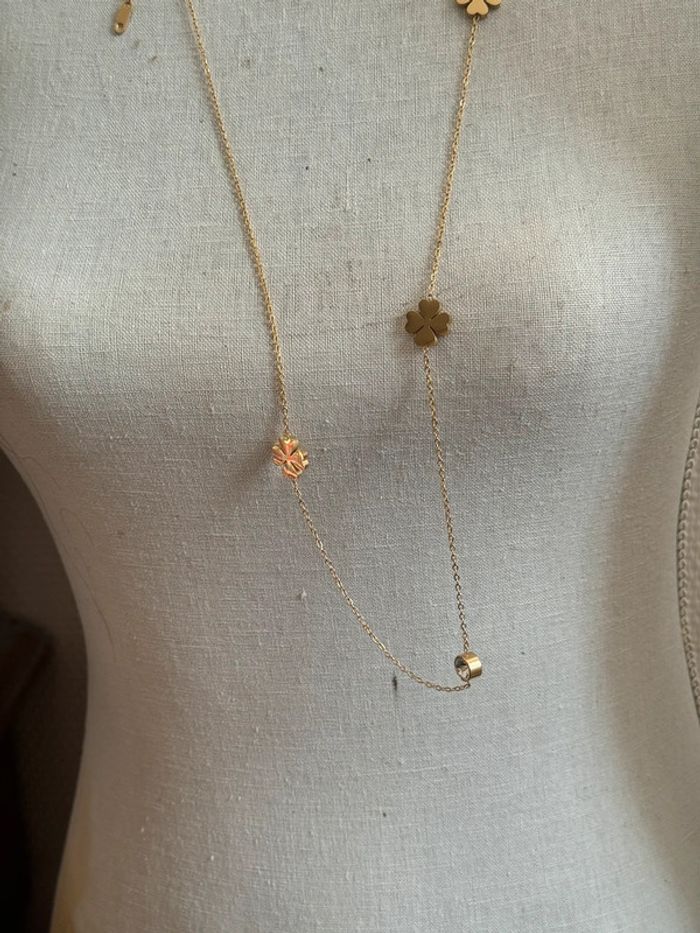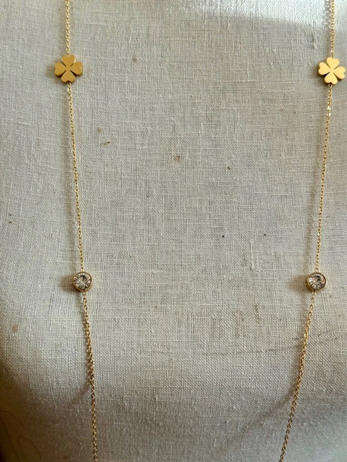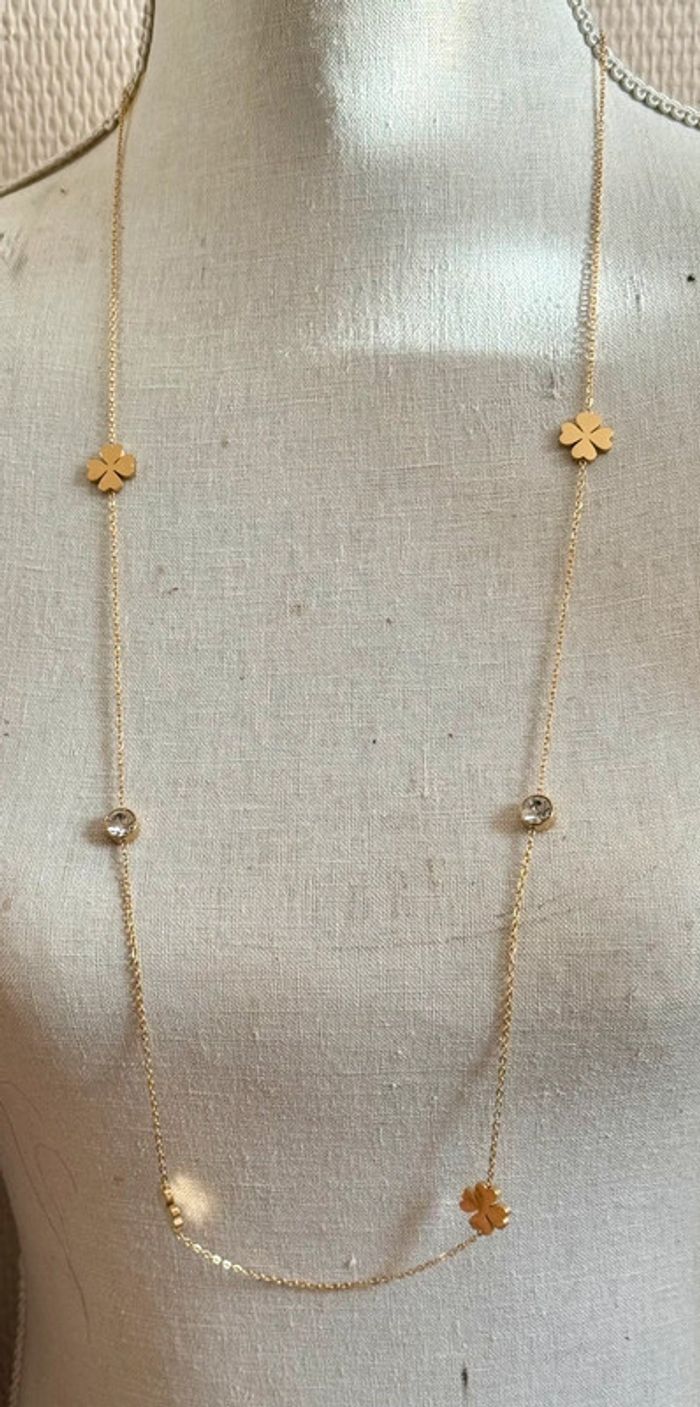 Sautoir réglable acier inoxydable or trèfles et cristaux réglable neuf dans pochon et pochette
