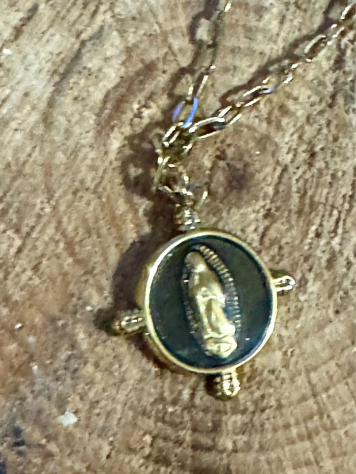 Collier mailles larges acier inoxydable or médaille ronde résine noire vierge en relief - photo numéro 5