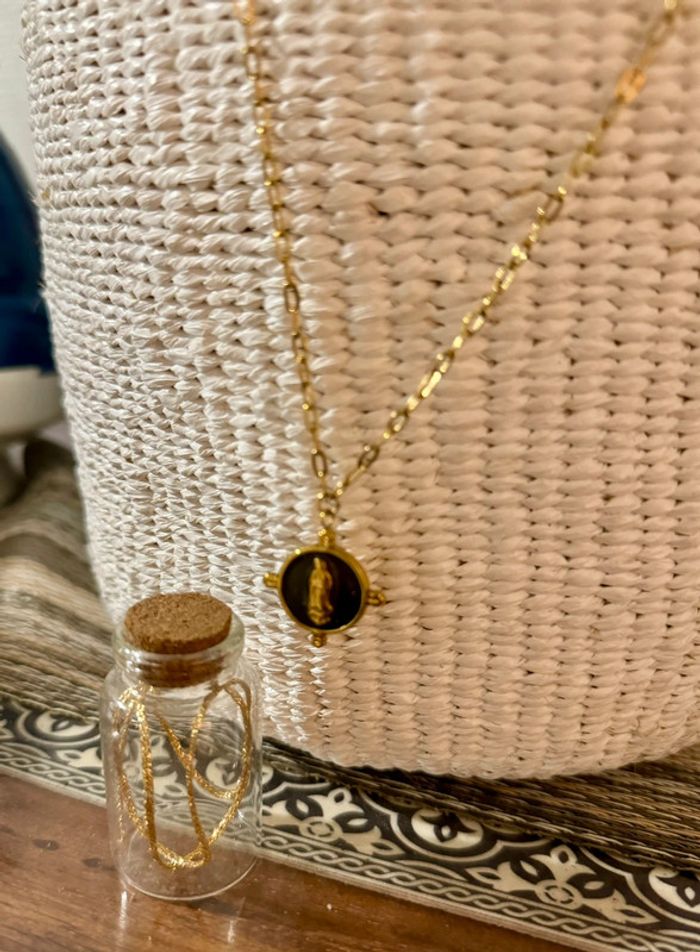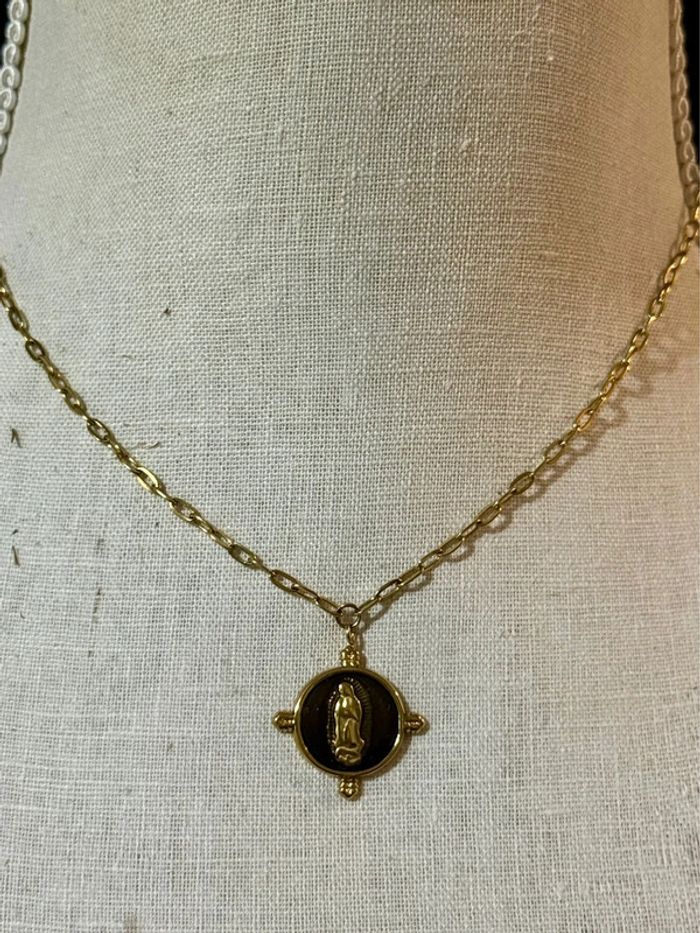 Collier mailles larges acier inoxydable or médaille ronde résine noire vierge en relief - photo numéro 1