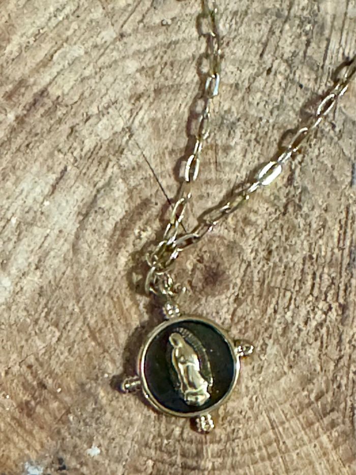 Collier mailles larges acier inoxydable or médaille ronde résine noire vierge en relief - photo numéro 2