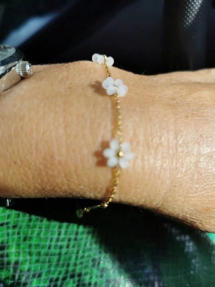Bracelet réglable acier inoxydable or fleurs perles nacrées blanches - photo numéro 2