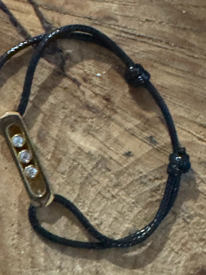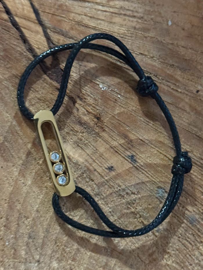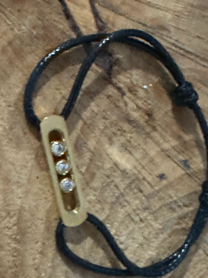 Bracelet cordon noir cuir épais épingle fermée acier inoxydable or 3 gros cristaux qui bougent à l’intérieur neuf dans pochon et pochette