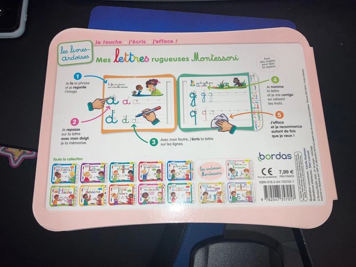 Livre Mes Lettres Rugueuses Montessori avec Feutre Jamais utilisé, en excellent état. Plusieurs pages ardoise pour apprendre à tracer les lettres de l’alphabet, idéal pour la rentrée 👍