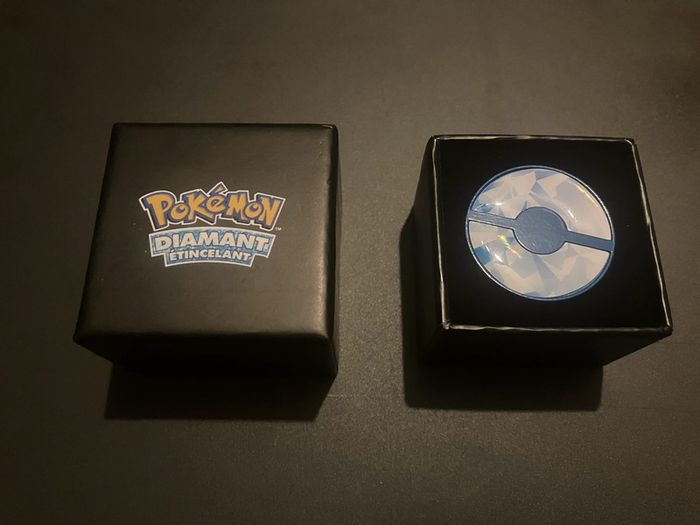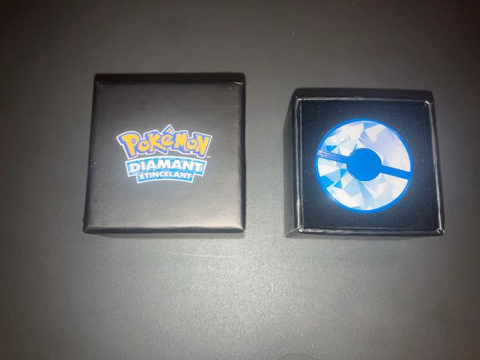 Pin's Pokémon Diamant Etincelant La boîte est sortie de son plastique d'emballage (que j'ai conservé et qui servira à emballer), mais le Pin's en lui-même n'a jamais été retiré de la boîte. Très bon état générale.