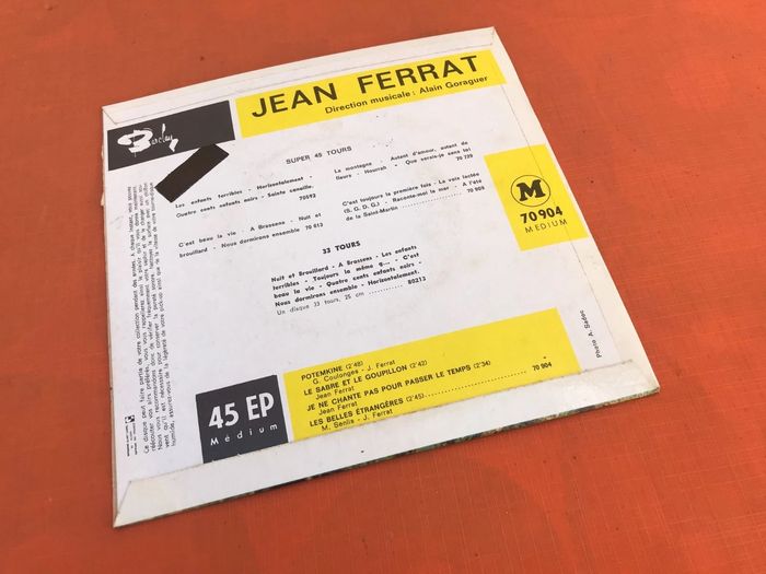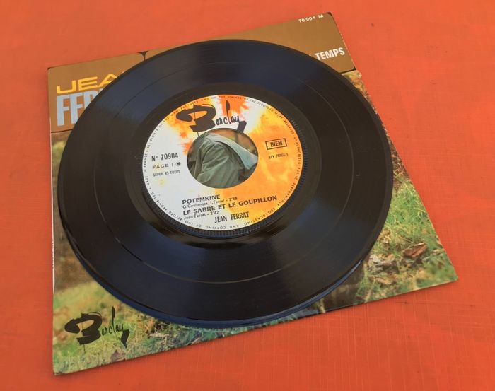 Vinyle 45 tours Jean Ferrat Potemkine (1965) Barclay 70904 A1 Potemkine Written-By – G. Coulonges*, J. Ferrat* 2:48 A2 Le Sabre Et Le Goupillon Written-By – Jean Ferrat 2:42 B1 Je Ne Chante Pas Pour Passer Le Temps Written-By – Jean Ferrat 2:34 B2 Les Belles Etrangères Written-By – J. Ferrat*, M. Senlis* 2:45