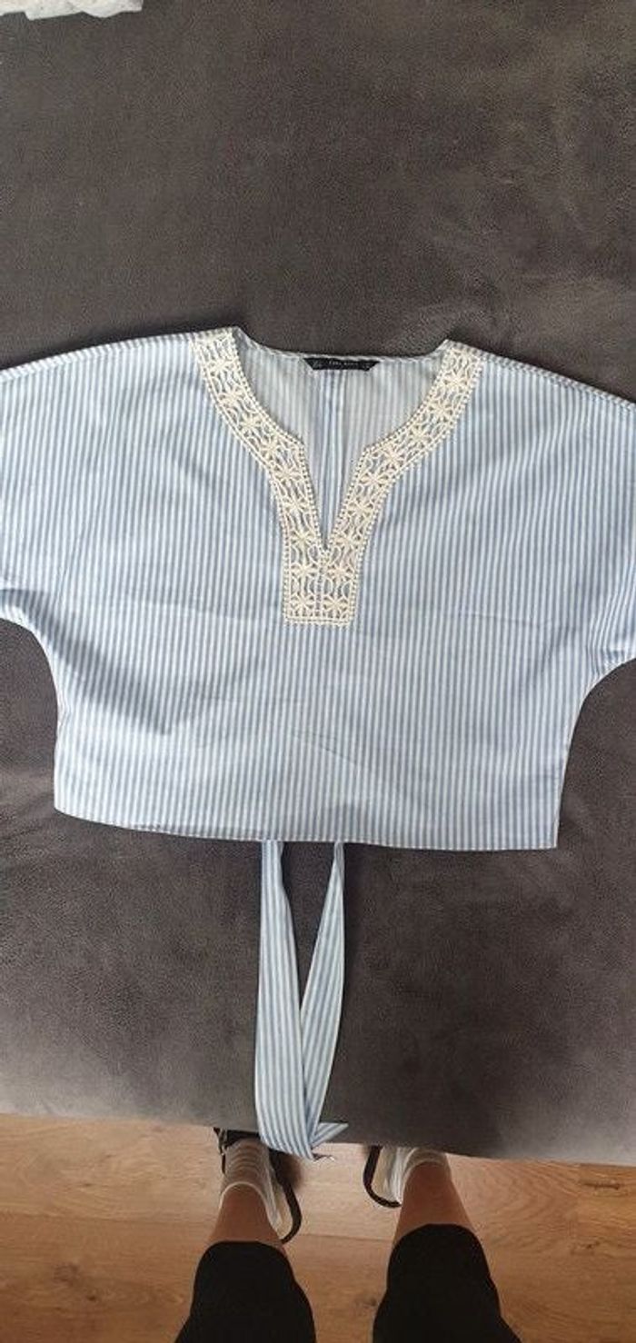 Blouse femme, de couleur bleue et blanche, détail dentelle sur le cou et le devant, manches courtes, petit lien sur l'arrière, hauteur 50 cm, taille L, très bon état, propre.