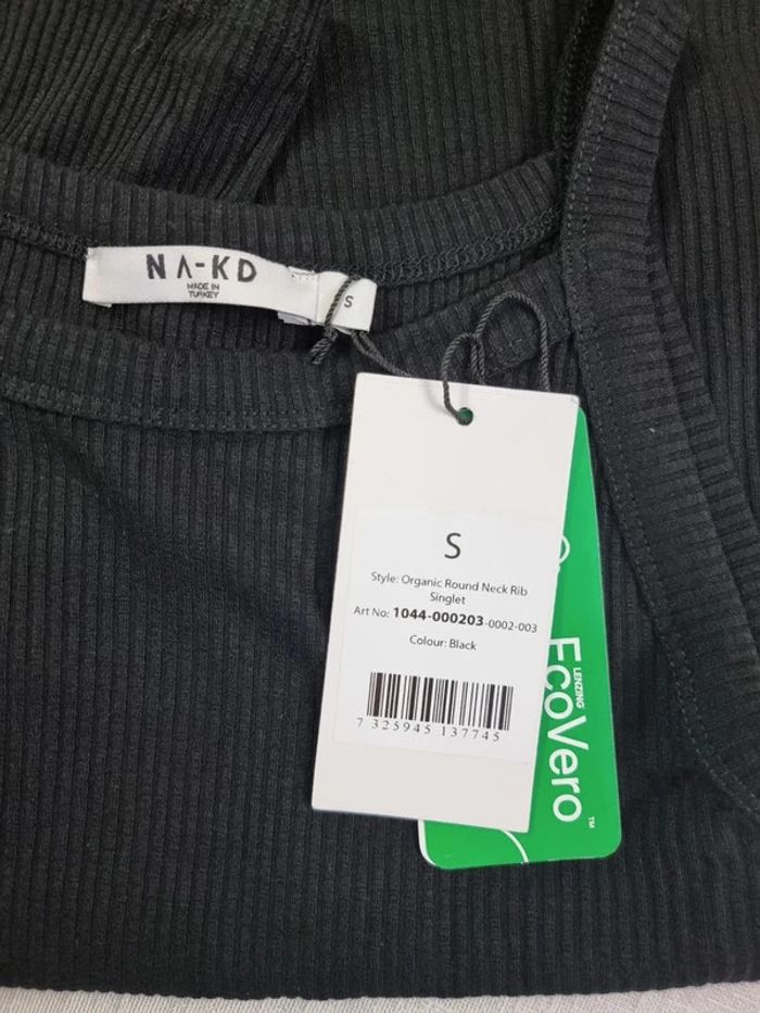 NA-KD Débardeur côtelé à col rond Noir Taille S NEUF avec étiquette Vendu 24,95 € Ce débardeur est sans manches et présente une encolure ronde. Il est doté d'une matière côtelée et extensible 95% viscose (95% LENZING™ ECOVERO™), 5% elastanne Longueur: 51 cm Aisselle à aisselle: 35 cm #NAKD #debardeurnoir36 ADN.63