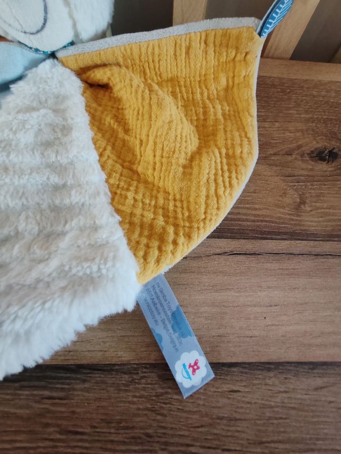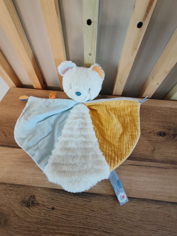 Nicotoy Arthur l'ours Doudou plat blanc gris jaune bleu 25 cm Environ Tbe Étiquette marque présente 15 euros envoi en relais