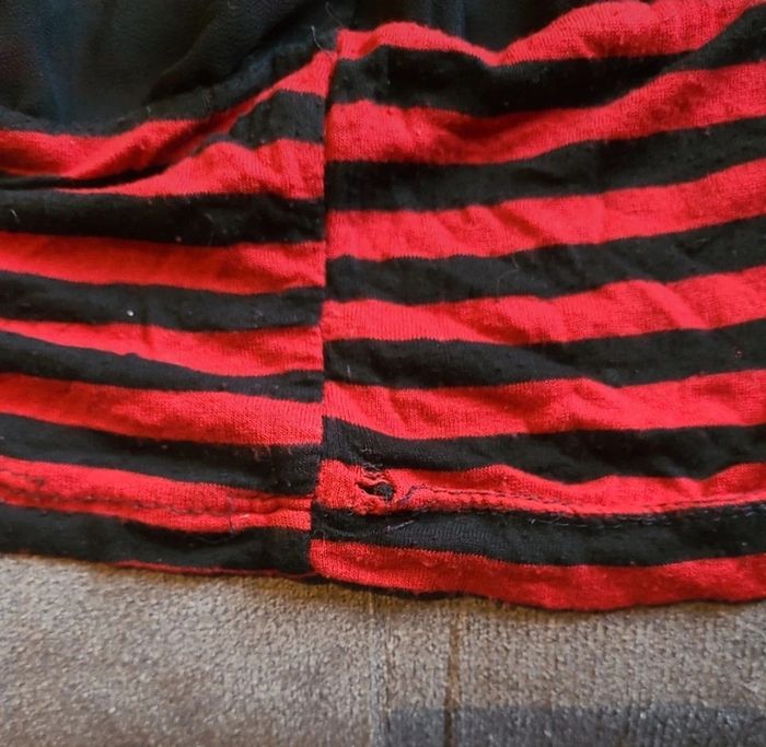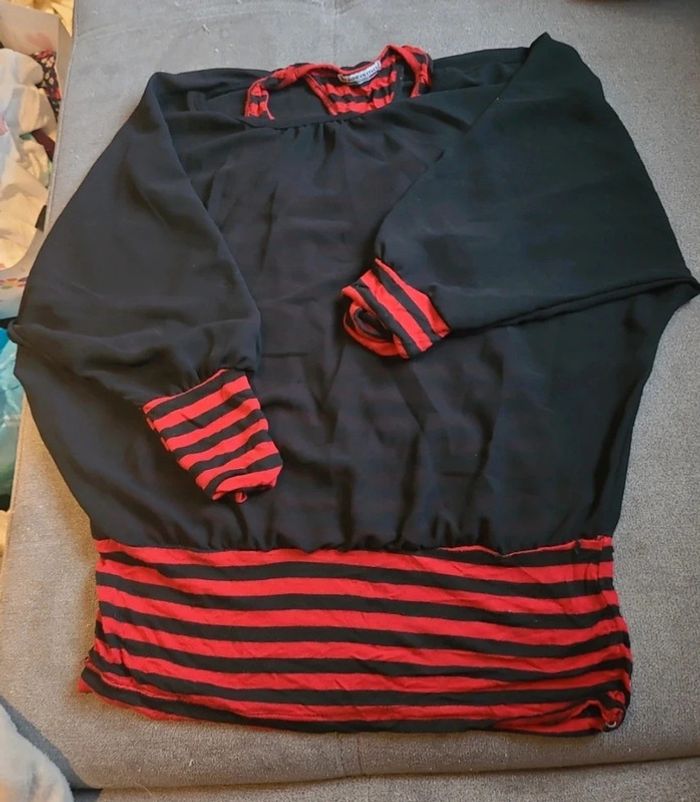 Haut noir avec débardeur rouge et noir rayé intégré à l'intérieur. Le noir est en transparence