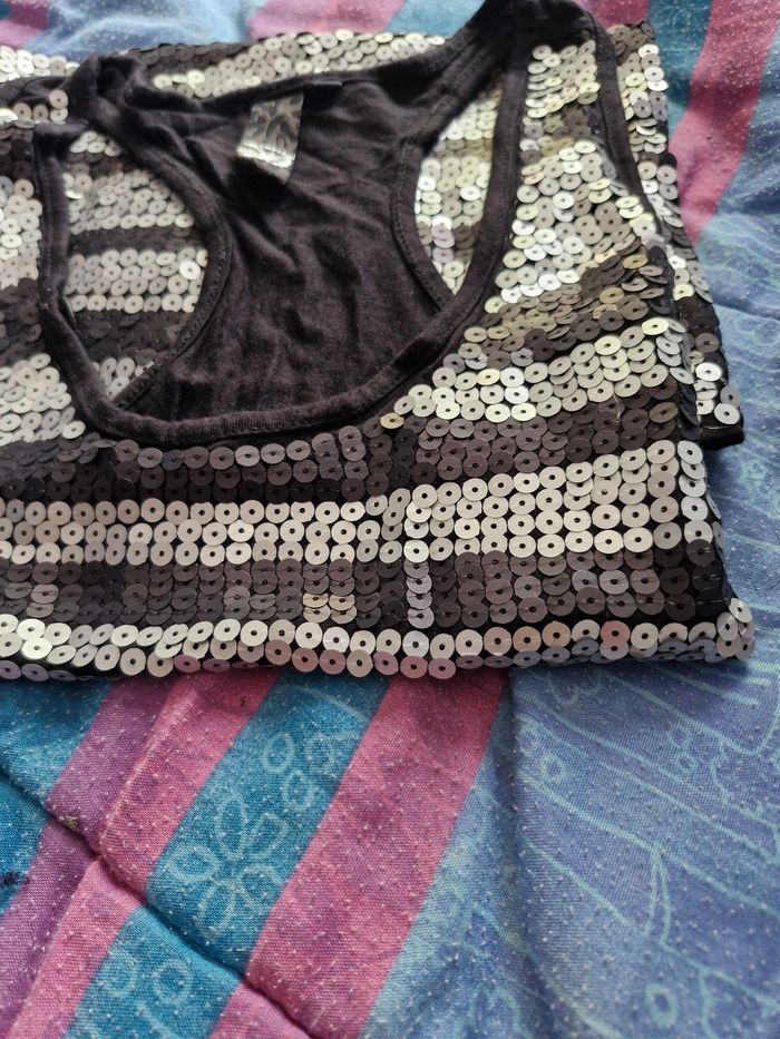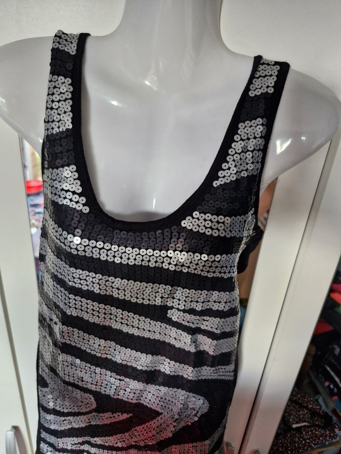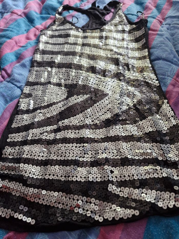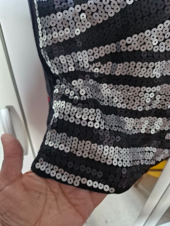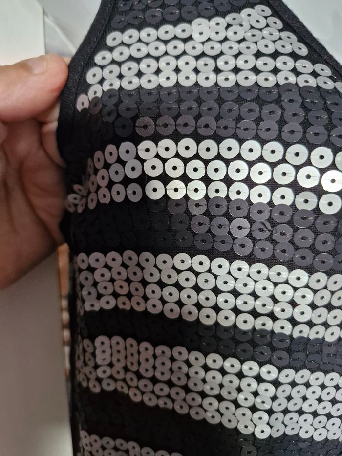 Cette robe est vraiment top originale en plus d'être ultra sexy. Tout d'abord, elle est coupée comme kn débardeur sportif, près du corps et aussi super confortable, avec son tissu extensible et doux. En plus, son design fait de sequins noirs et argentés mates donne un côté chic et feminin pour vos soirées. Mesures Aisselles de 38cms à plat à 42cms en tirant Taille de 32cms à plat à 41cms en tirant Hauteur 71cms Je n'ai pas remarqué d'anomalie