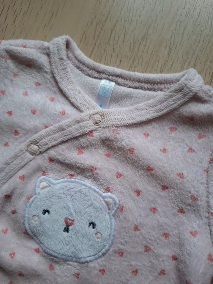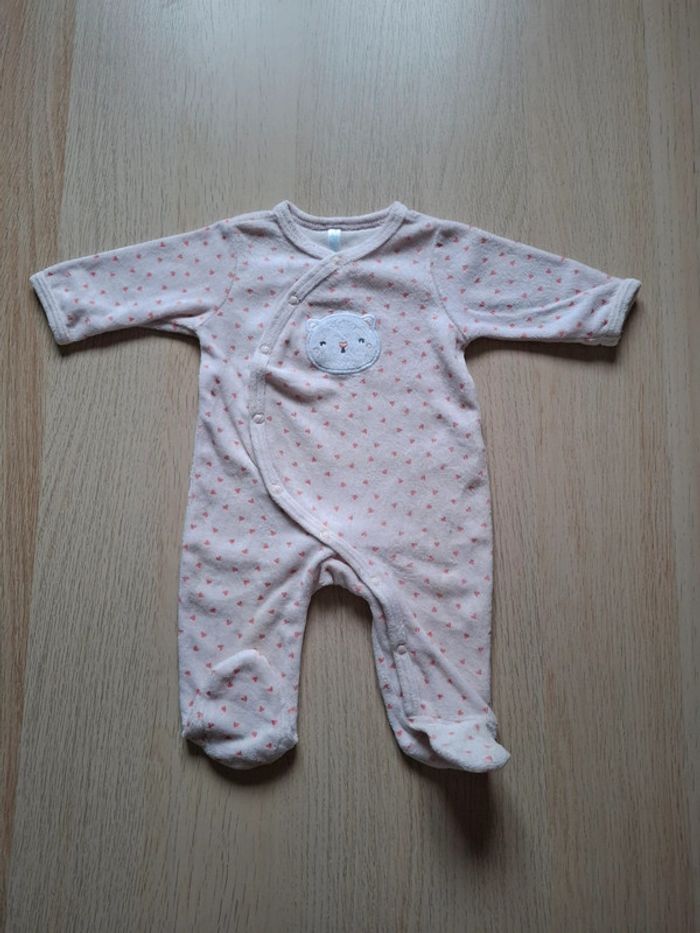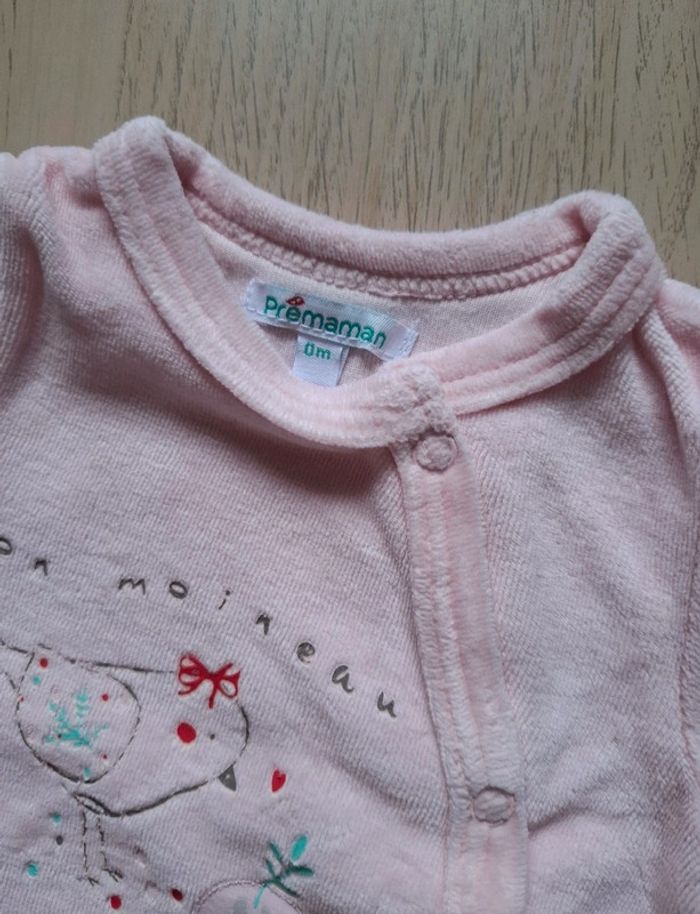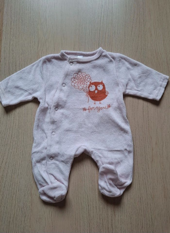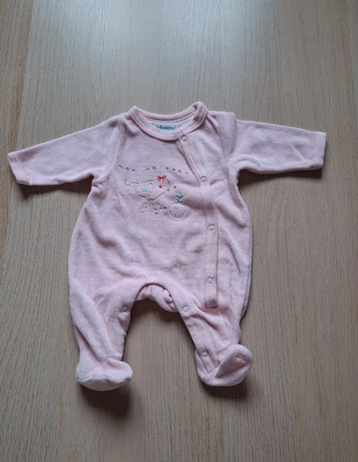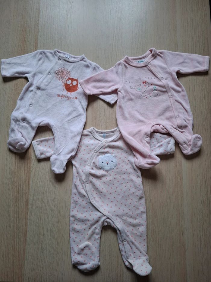 Lot de 3 pyjamas taille naissance (50cm). Les 2 du haut sont en très bon état ; le 0-1 mois du bas est un peu taché (voir photos) et taille un peu plus grand.