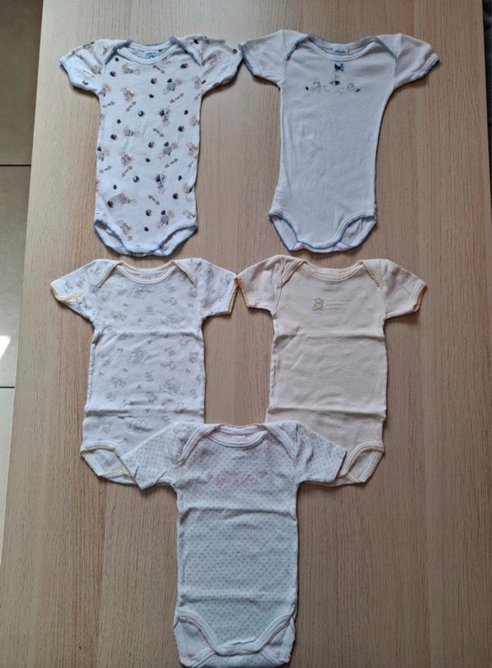Lot de 5 bodies manches courtes (bon état général, quelques petites bouloches, une petite auréole jaune sur l'un d'eux) + 1 body débardeur NEUF offert Marque Petit Bateau et Absorba Taille 6 mois (67cm)