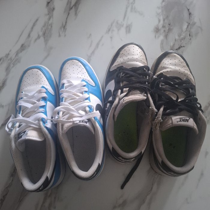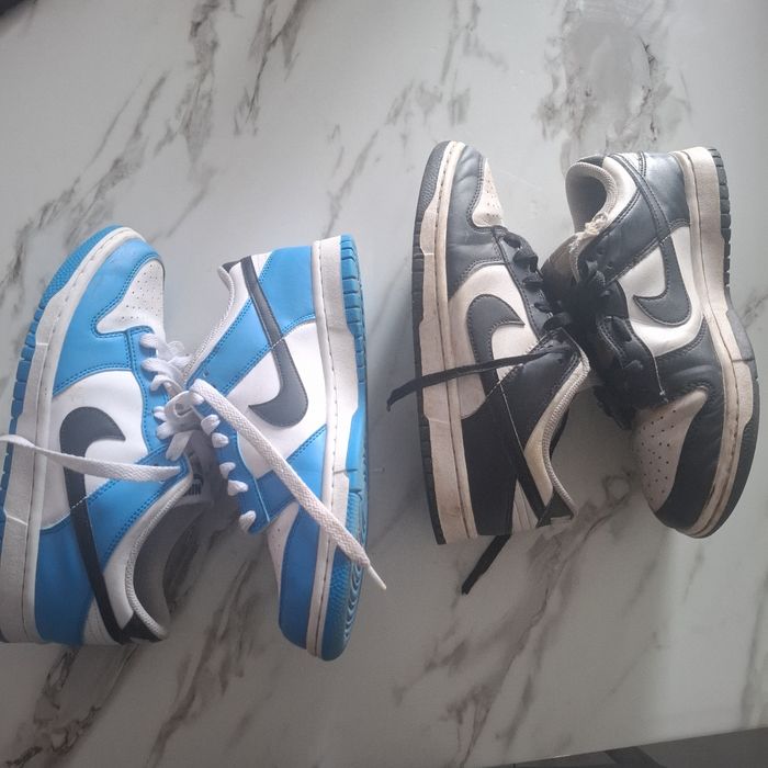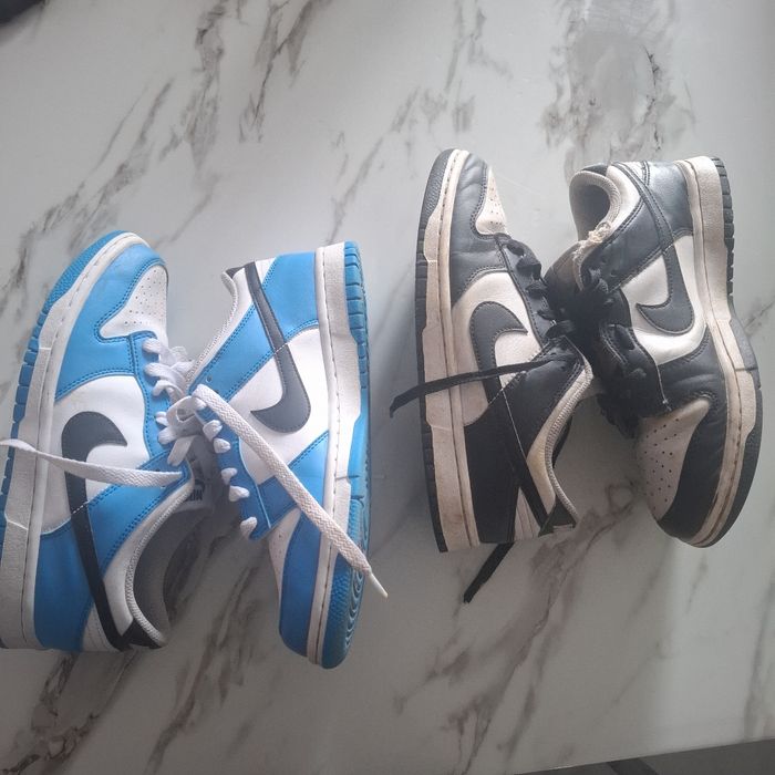 de baskets Nike Dunk, une paire est bleue et blanche, l'autre est noire et blanche. Les deux paires ont le logo Nike sur le côté. Très bon état et bon état