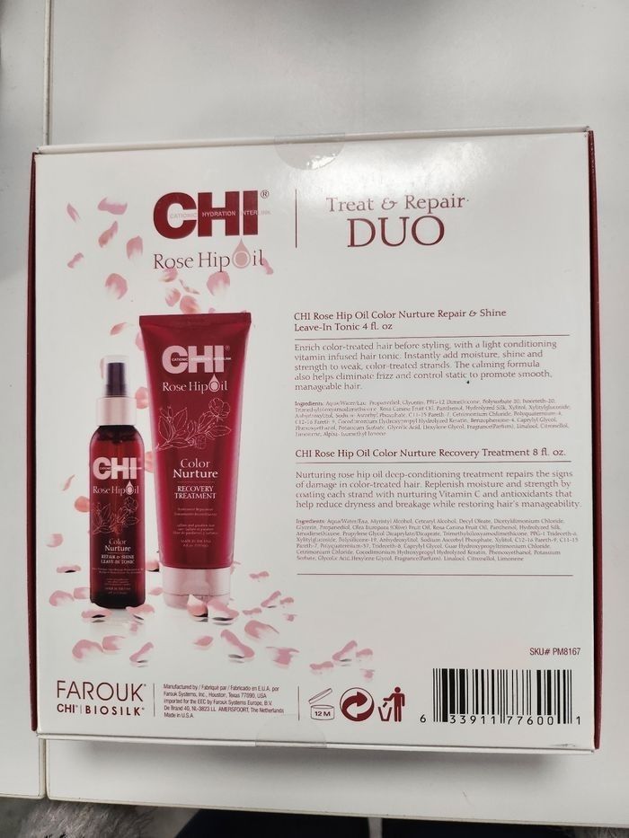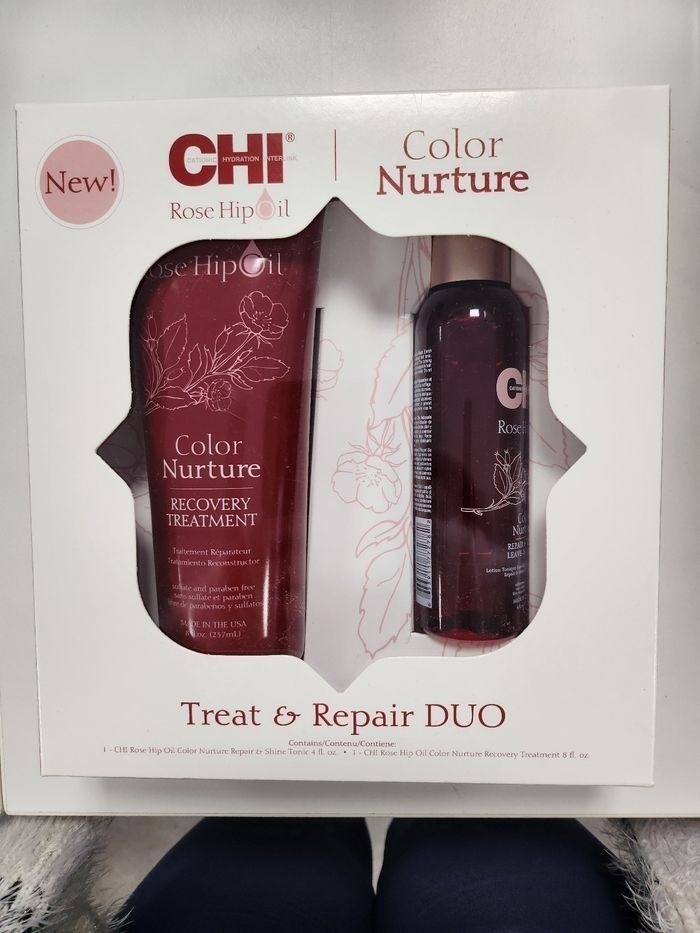 Pour des cheveux coloré qui ne manquent pas de vitalité, craquez pour ces soins à la rose musquée. Le traitement après shampoing repare, hydrate et nourrit la fibre capillaire en profondeur. Quant au spray sans rinçage, il dompte les frisottis et fait briller le cheveux pour faciliter le coiffage. Les cheveux sont soyeux et leur couleur durablement protégée et éclatante de beauté. Ce kit contient : 1 traitement après shampoing réparateur cheveux colorés 237ml 1 spray réparateur sans rinçage 118ml