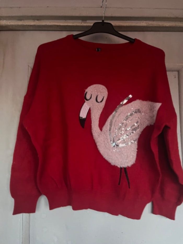 Pull rouge, motif flamant, rose porté quelques fois. Taille unique