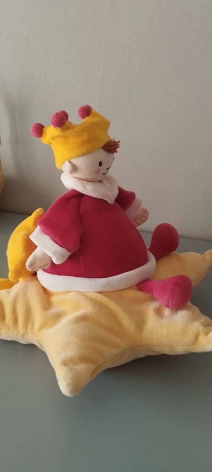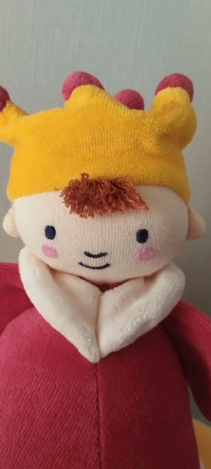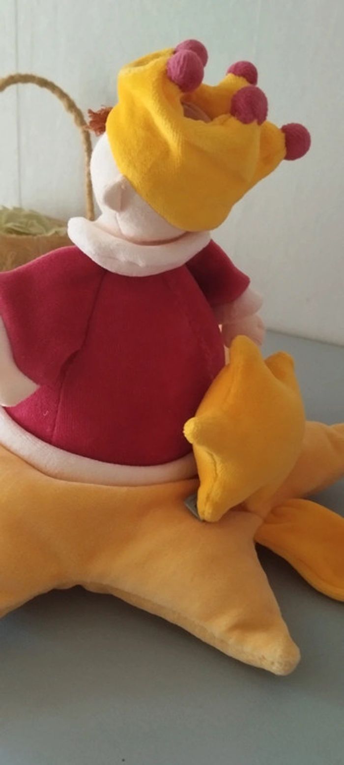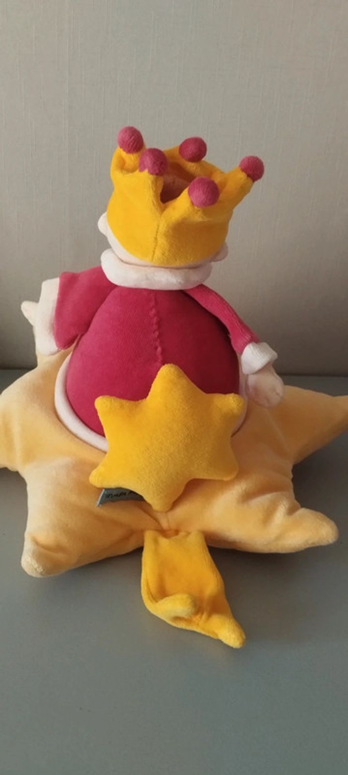 Lutin roi, doudou, peluche musicale Mélodie, berceuse "ah vous dirais je maman" Fonctionne parfaitement. Hauteur 25 cm. Couture du dos reprisée. Très bon état. #linejacpeluches