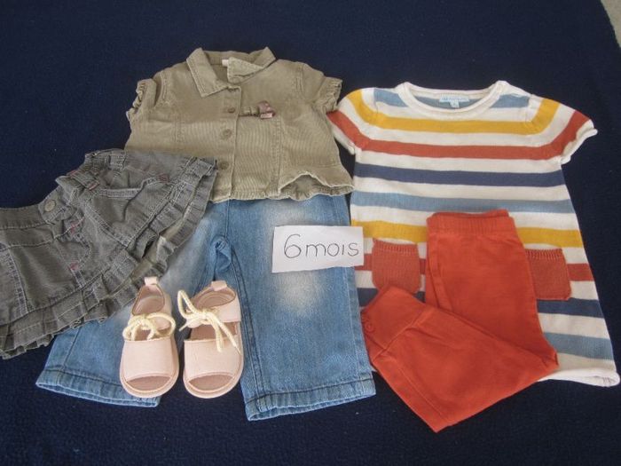 6 mois, ensemble 2 pièces + chemisier + jean + jupe + paire de chaussures neuves, disney, boite à malices