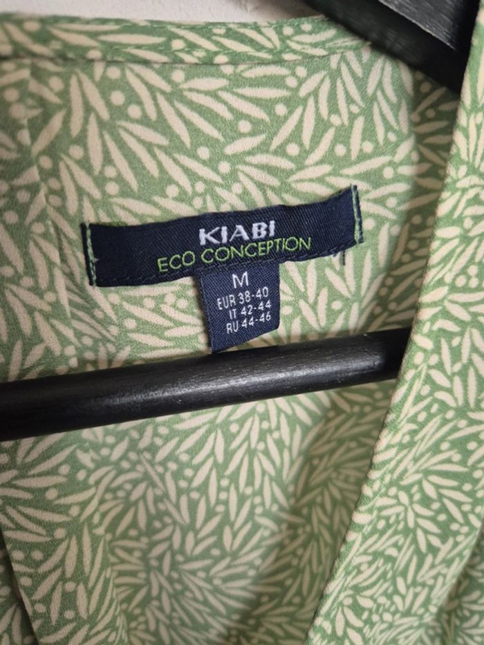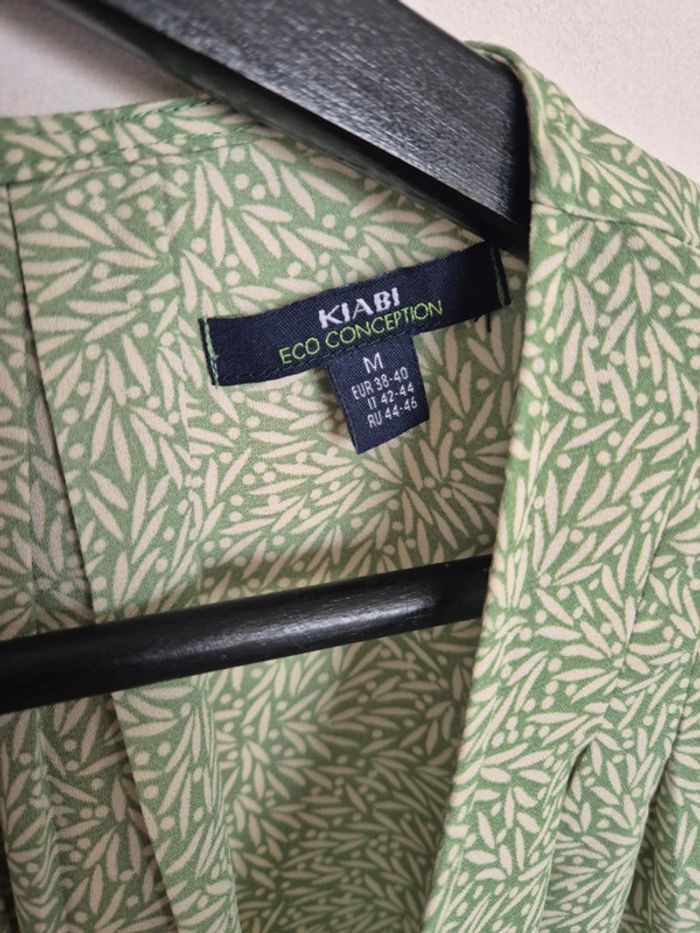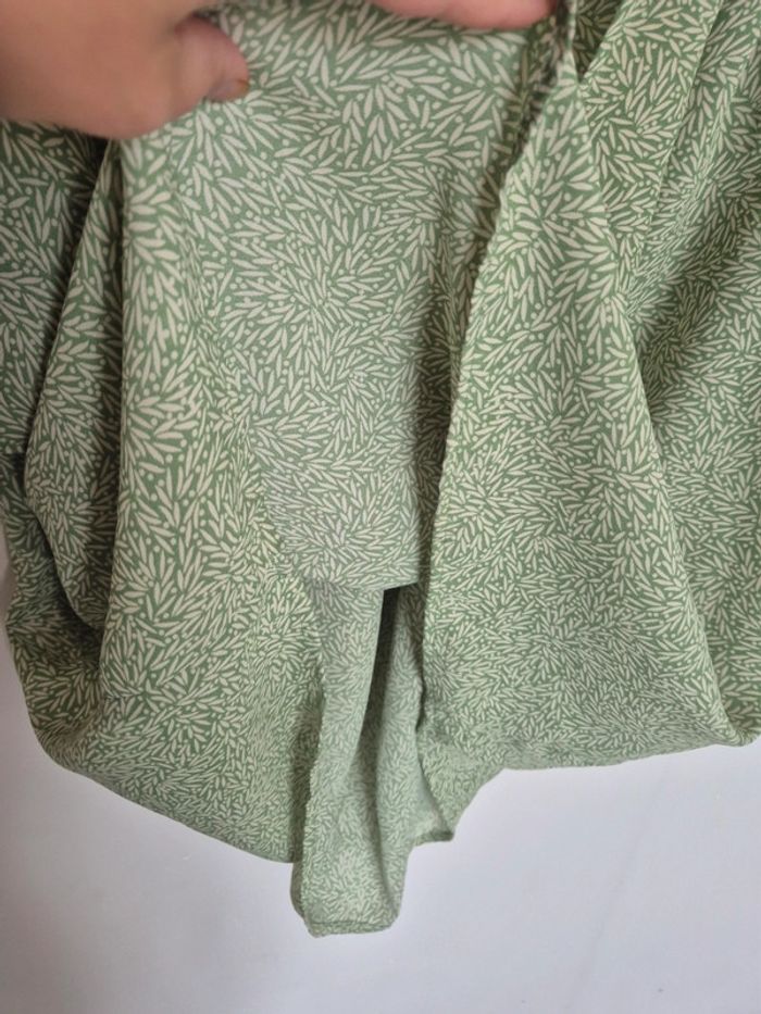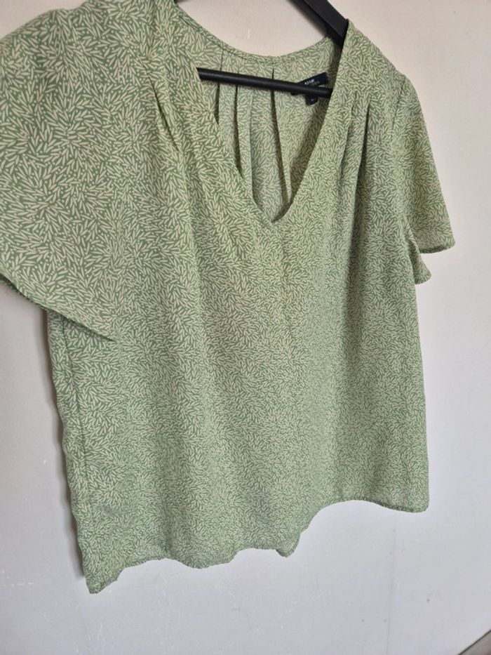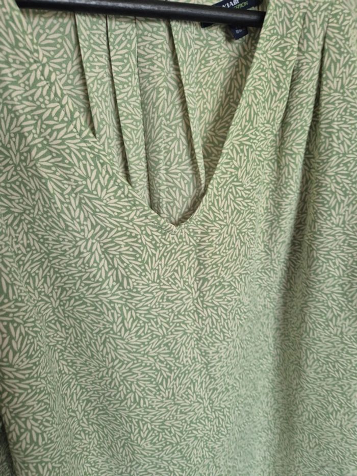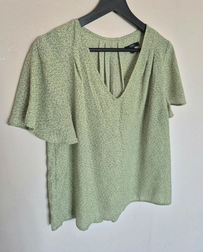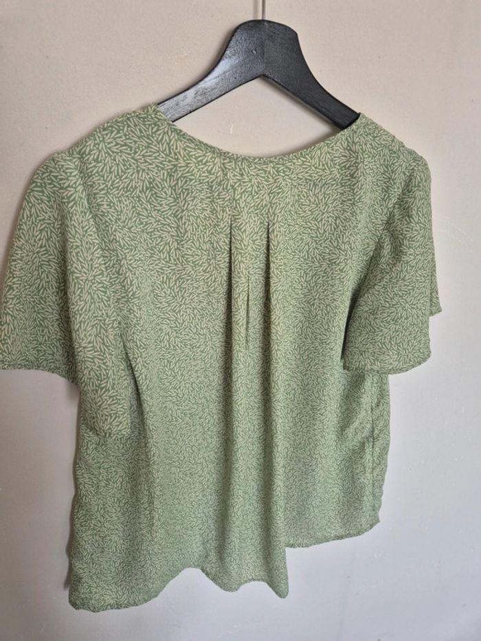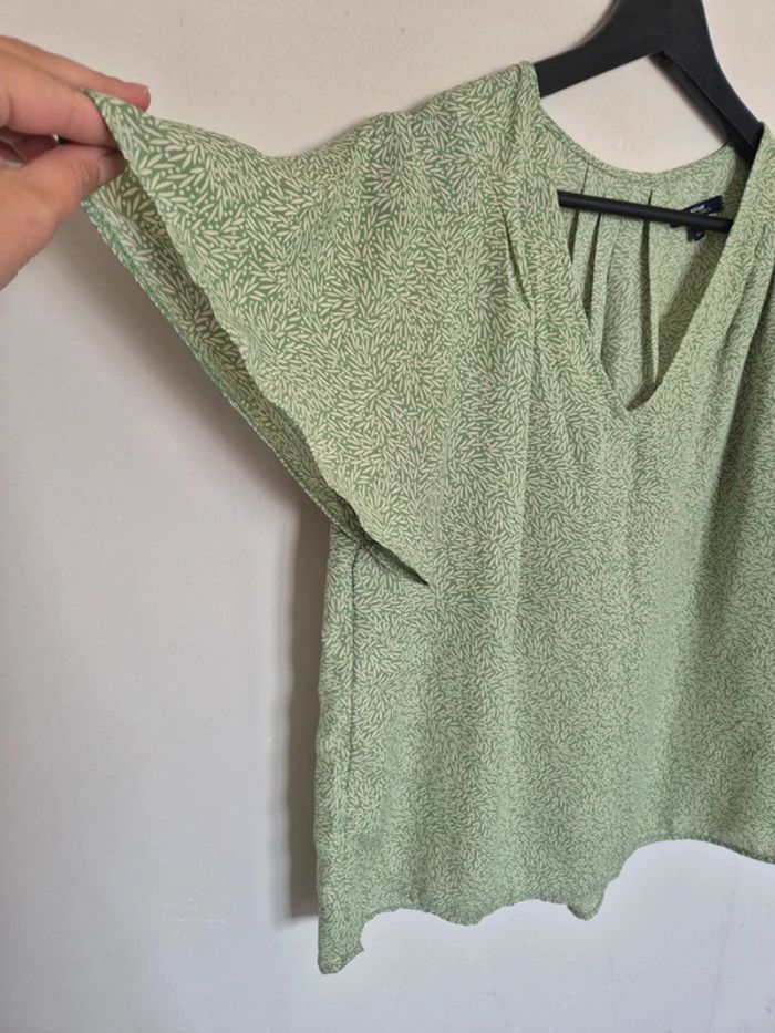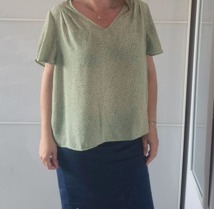 Blouse verte avec motif feuille, manche courte, très fluide,