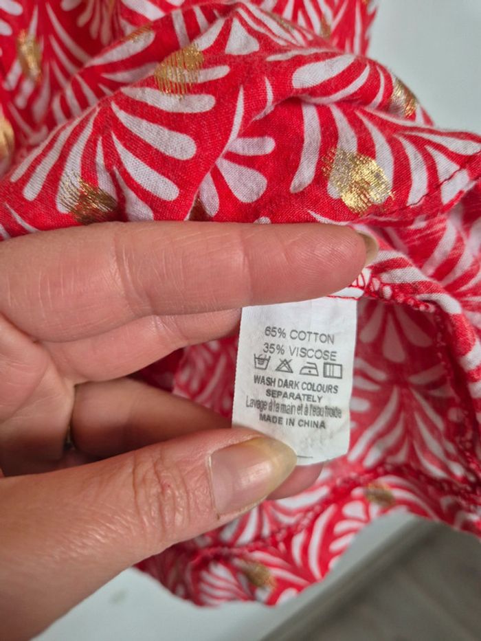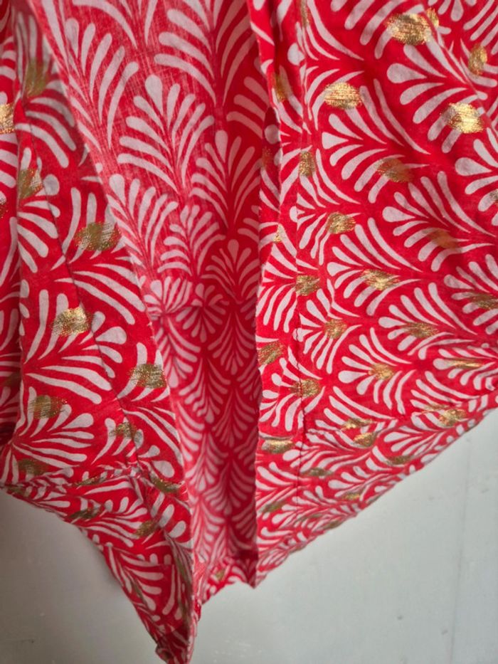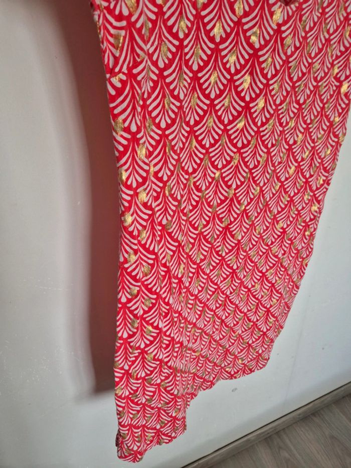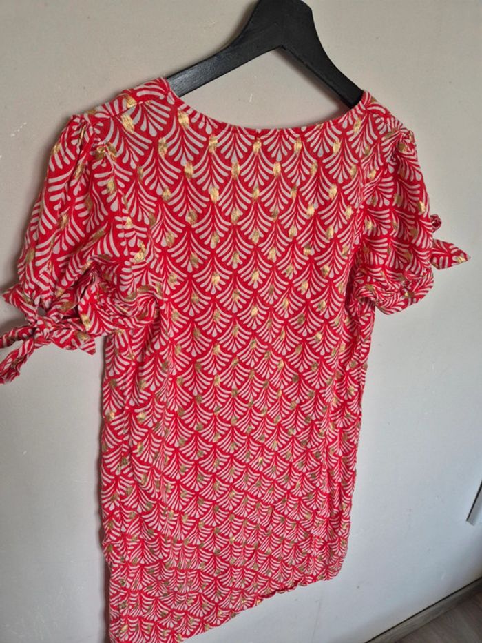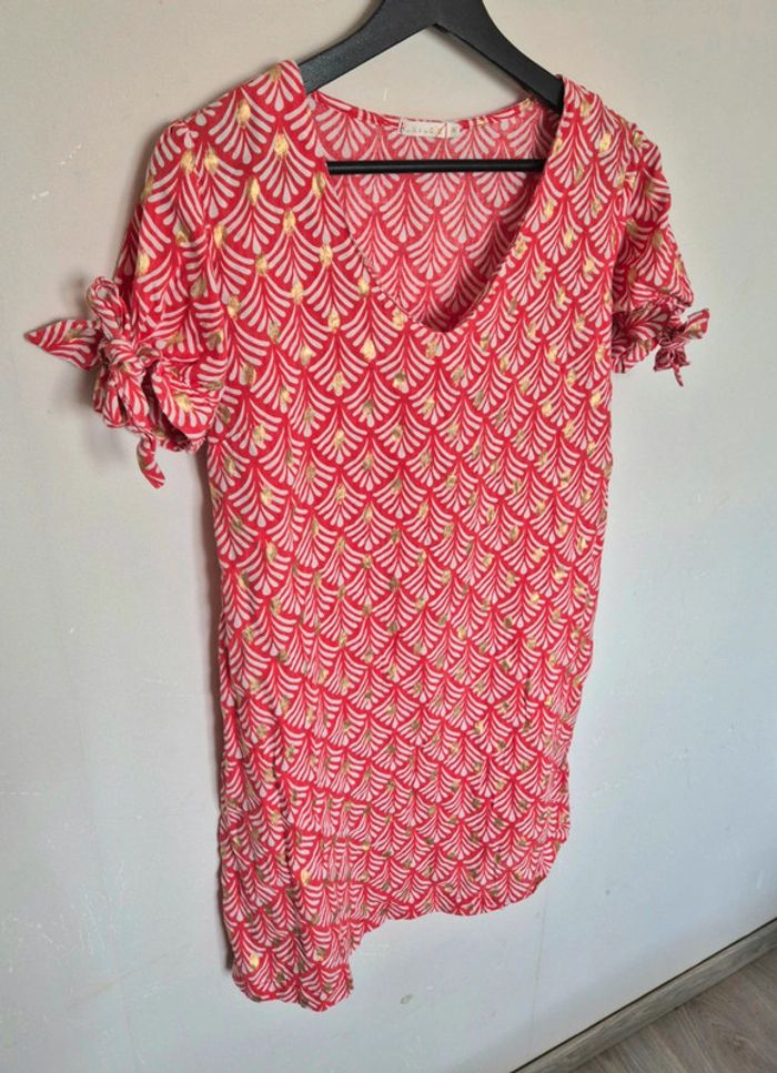 Robe courte, rose avec des motif blanc et doré, manche courte, très légère sans doublure,