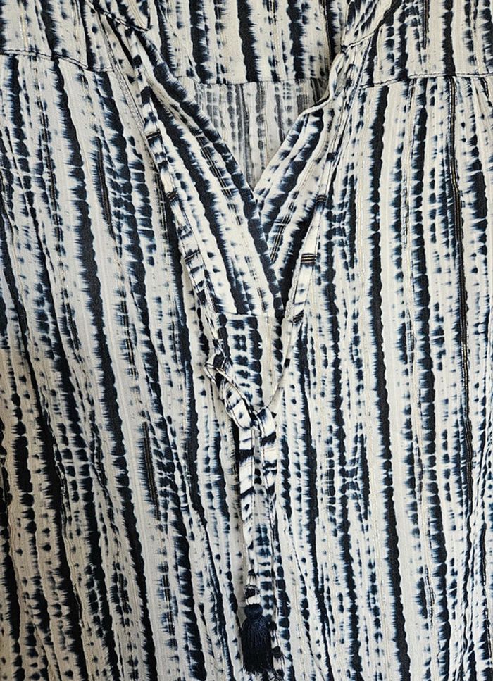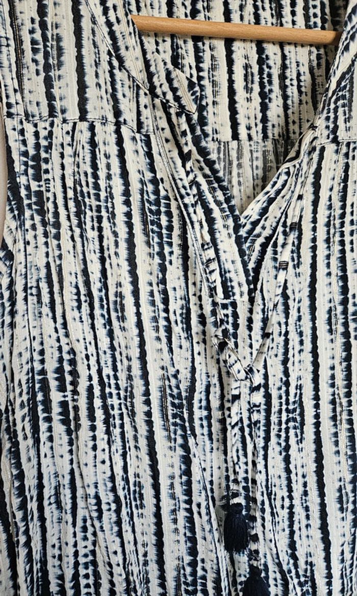 Blouse sans manche, bleu et blanche, lien à nouer sur le devant, très légère et fluide