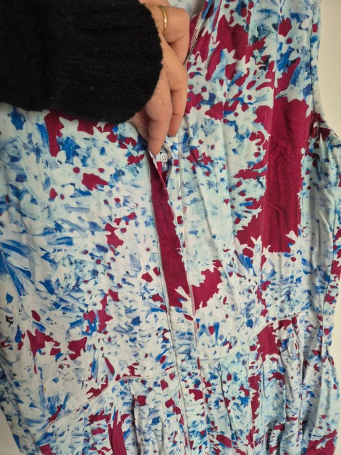 Robe blanche avec motifs rose et bleu, boutonnée sur le haut et fluide sur le bas,