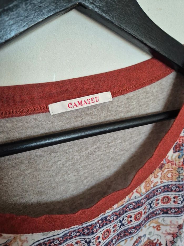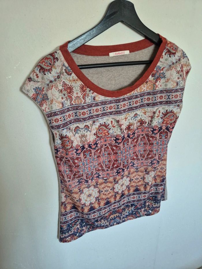 📌 Lot 20% de remise pour l'achat de 5 articles, suite ... T-shirt beige et rouge à motif, uni dans le dos, manche courte, ➡️Largeur à plat sous les bras  47 cm ➡️Longueur 61 cm ➡️étiquette composition manquante ⭐ Excellent état ✈Envoi rapide des colis 💗 Abonnez vous à mon profil, nombreux articles ajoutés régulièrement ! 🌸 Tapez Laetitresors pour voir mes annonces #laetitresors_blouse38 #blouse #camaieu #tshirt #beige #motif #marron #manche #courte #rouge #top #laetitresors