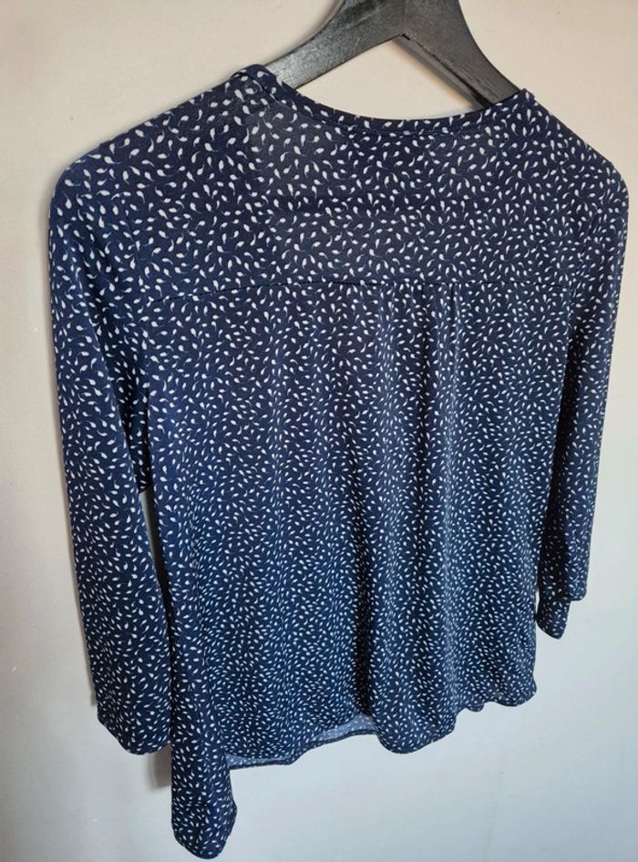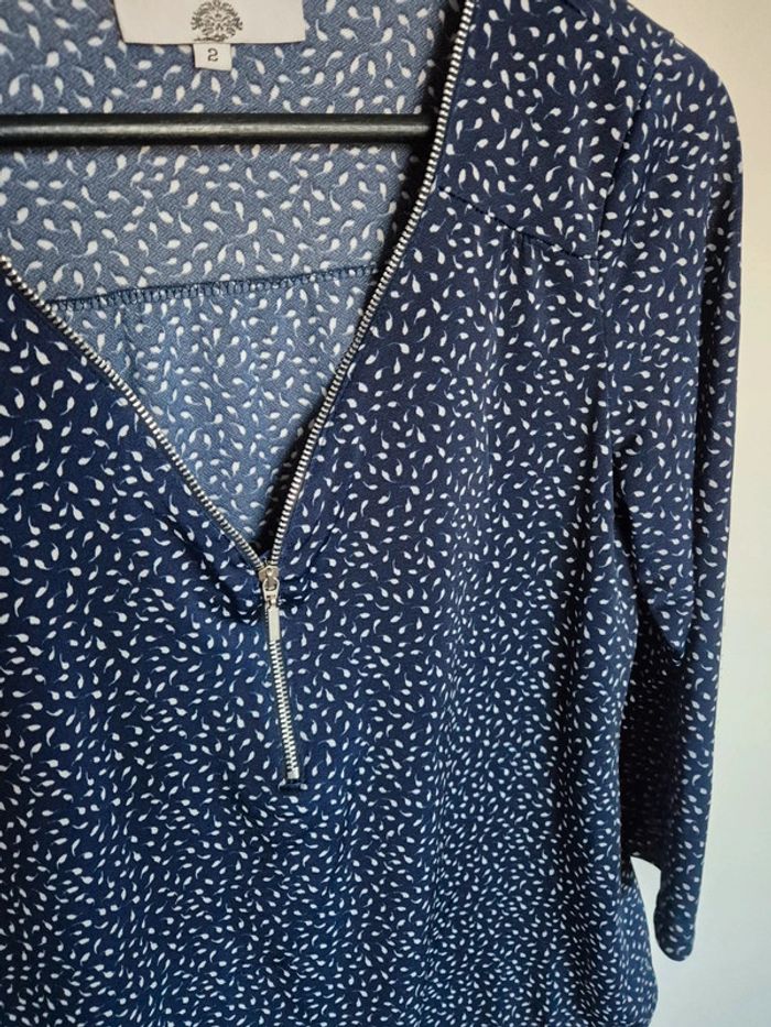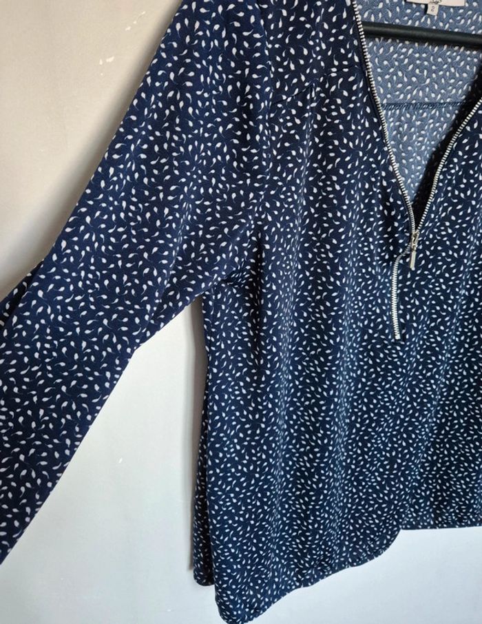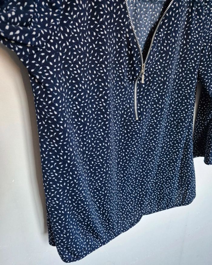 Blouse bleu marine à pois blanc, manche 3/4, fermeture éclair sur le haut, élastique sur le bas,